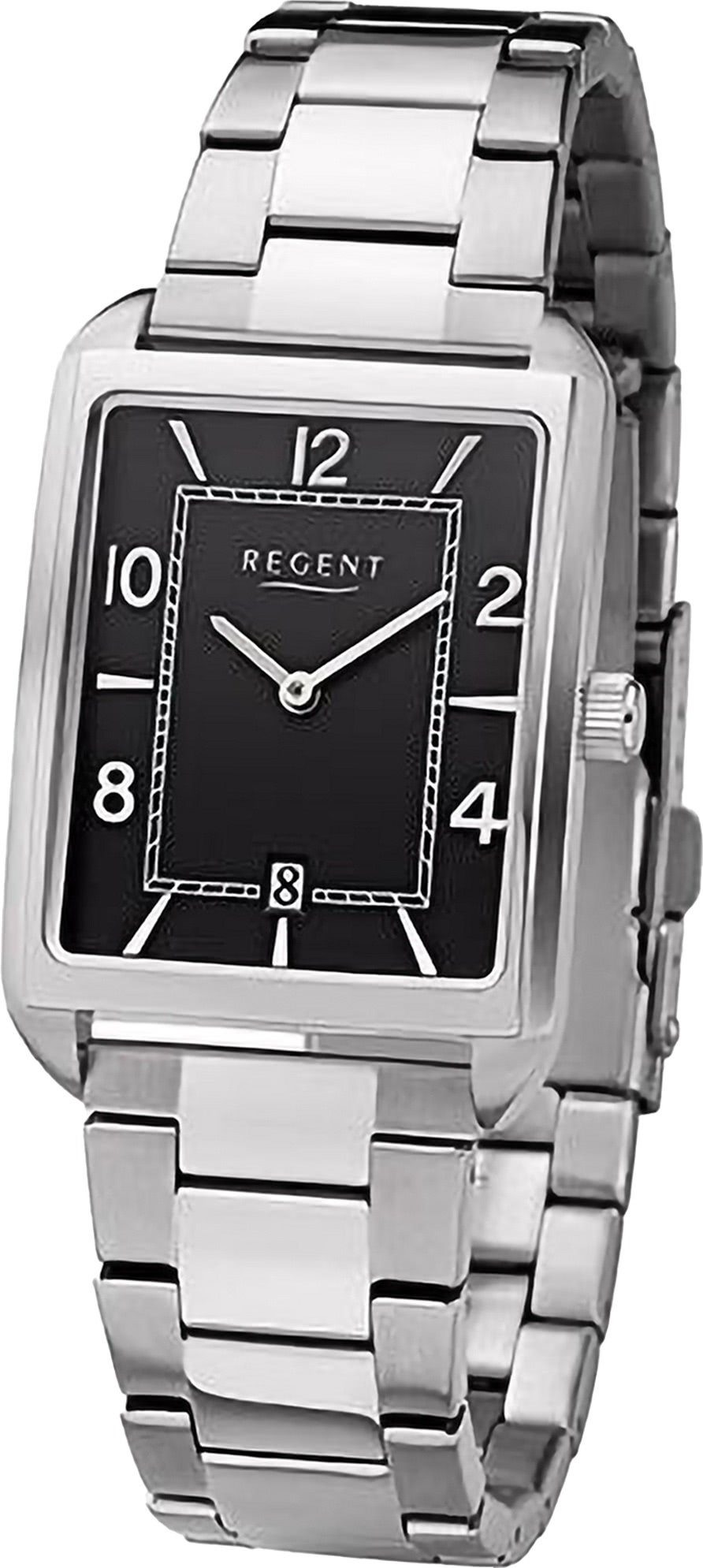 Die Casual Uhr der Marke Regent hat ein schönes Armband aus Metall in silber mit Faltschließe. Eine Uhr aus der Regent Metallarmband Kollektion für Herren in der Gehäusefarbe silber mit Quarzwerk. Die Analoguhr mit Mineralglas hat ein Zifferblatt in der Farbe schwarz. Die Form der Uhr ist rund und das Gehäuse ist extra groß ca. 28,5x41,5mm im Durchmesser.