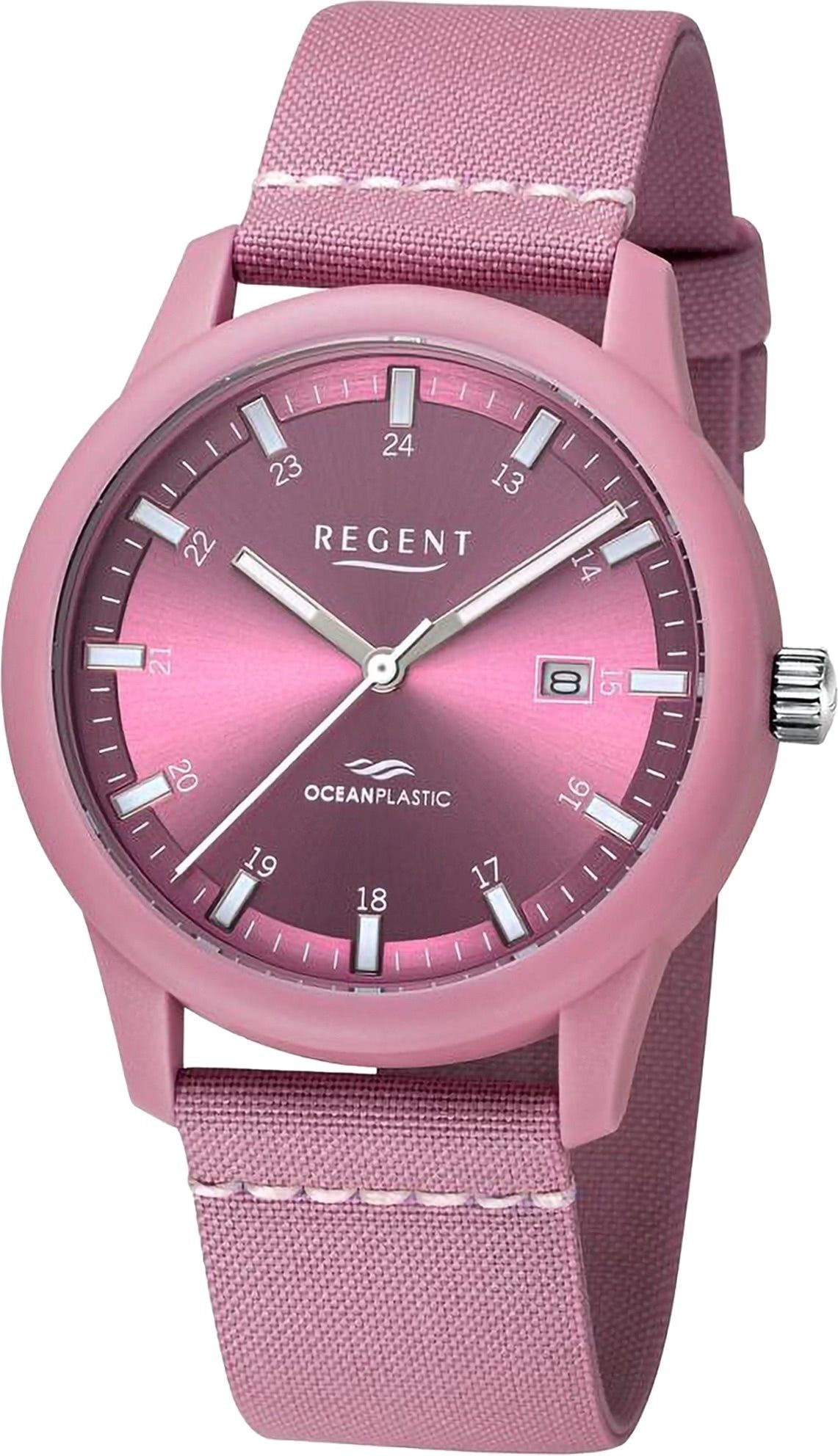Die Casual Uhr der Marke Regent hat ein schönes Armband aus Nylon in lila mit Dornschließe. Eine Uhr aus der Regent Lederarmband Kollektion für Herren in der Gehäusefarbe lila mit Quarzwerk. Die Analoguhr mit Mineralglas hat ein Zifferblatt in der Farbe lila. Die Form der Uhr ist rund und das Gehäuse ist groß ca. 40mm im Durchmesser.