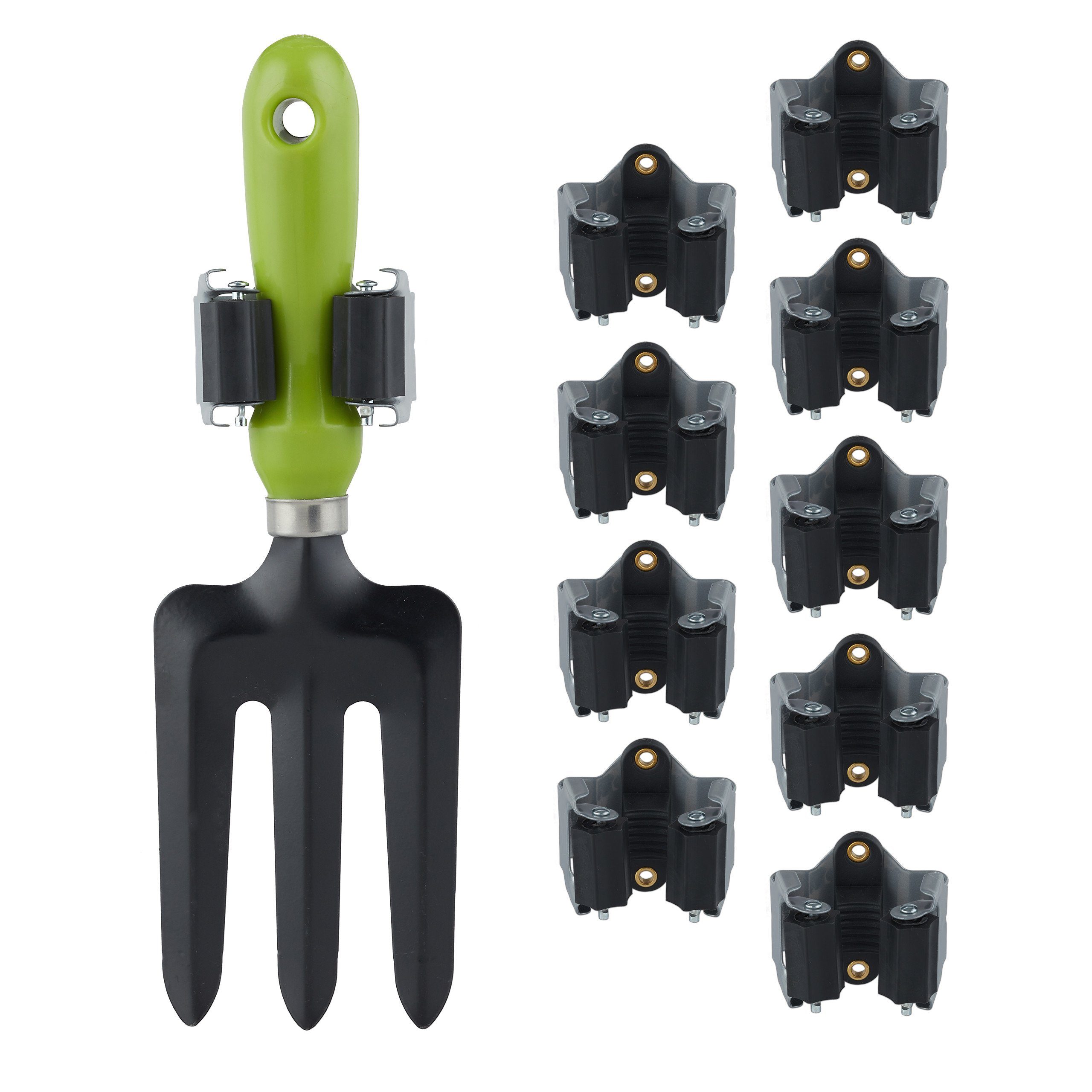 Ärgern Sie sich immer wieder über Gerätschaften, die überall auftauchen, nur nie dort, wo Sie sie benötigen? Mit dem Gerätehalter im 20er Set bereiten Sie diesem Spuk ein Ende. Die Rollen aus abriebfestem Gummi passen sich der Griffstärke an und sind schonend zu Schaufel, Besen und Co. Im Abstellraum, Schuppen oder in der Garage sorgen Sie mit den Stielhaltern für Ordnung. Schrauben oder hämmern Sie die Halter an Wände oder Türen - die dazu erforderlichen Löcher sind bereits vorhanden.