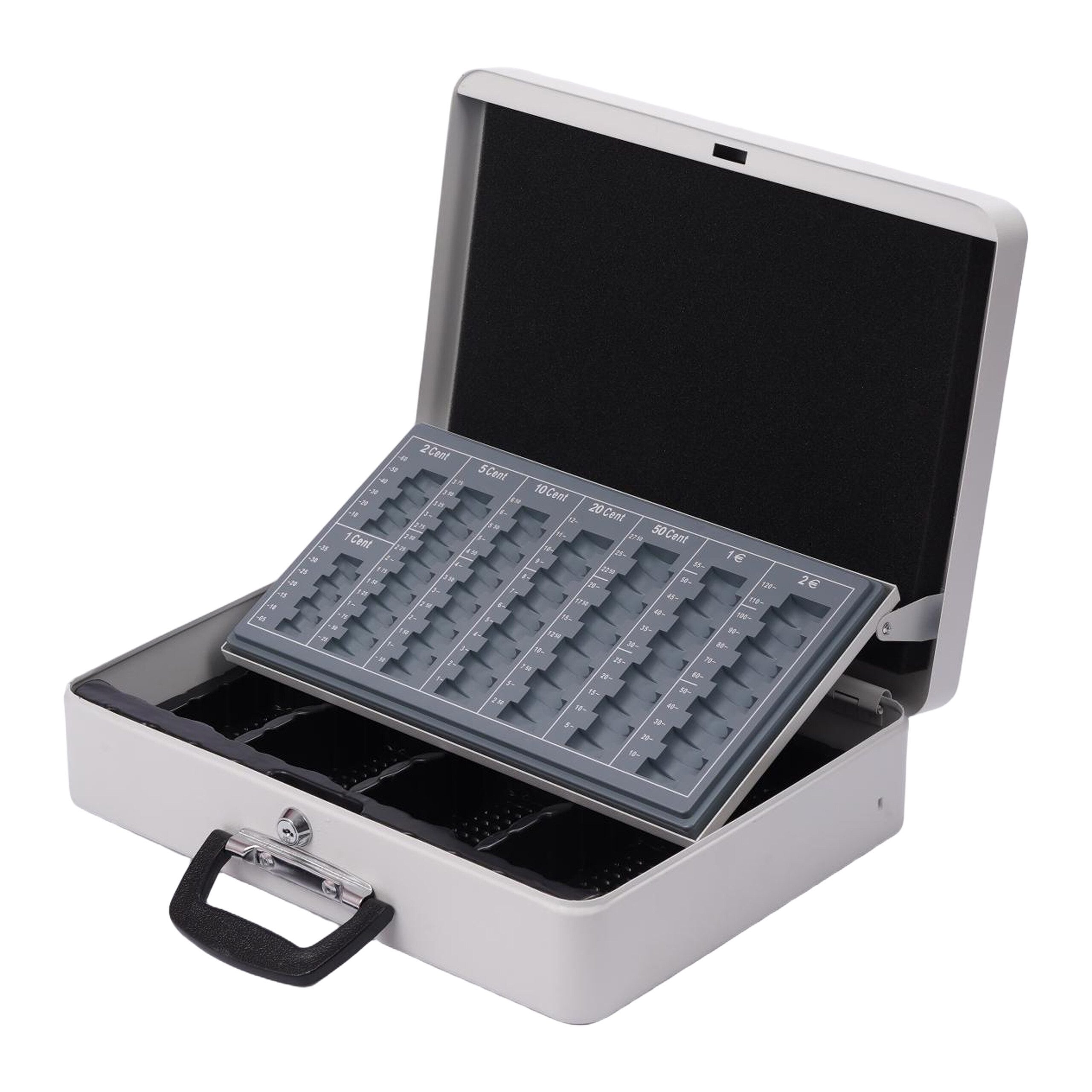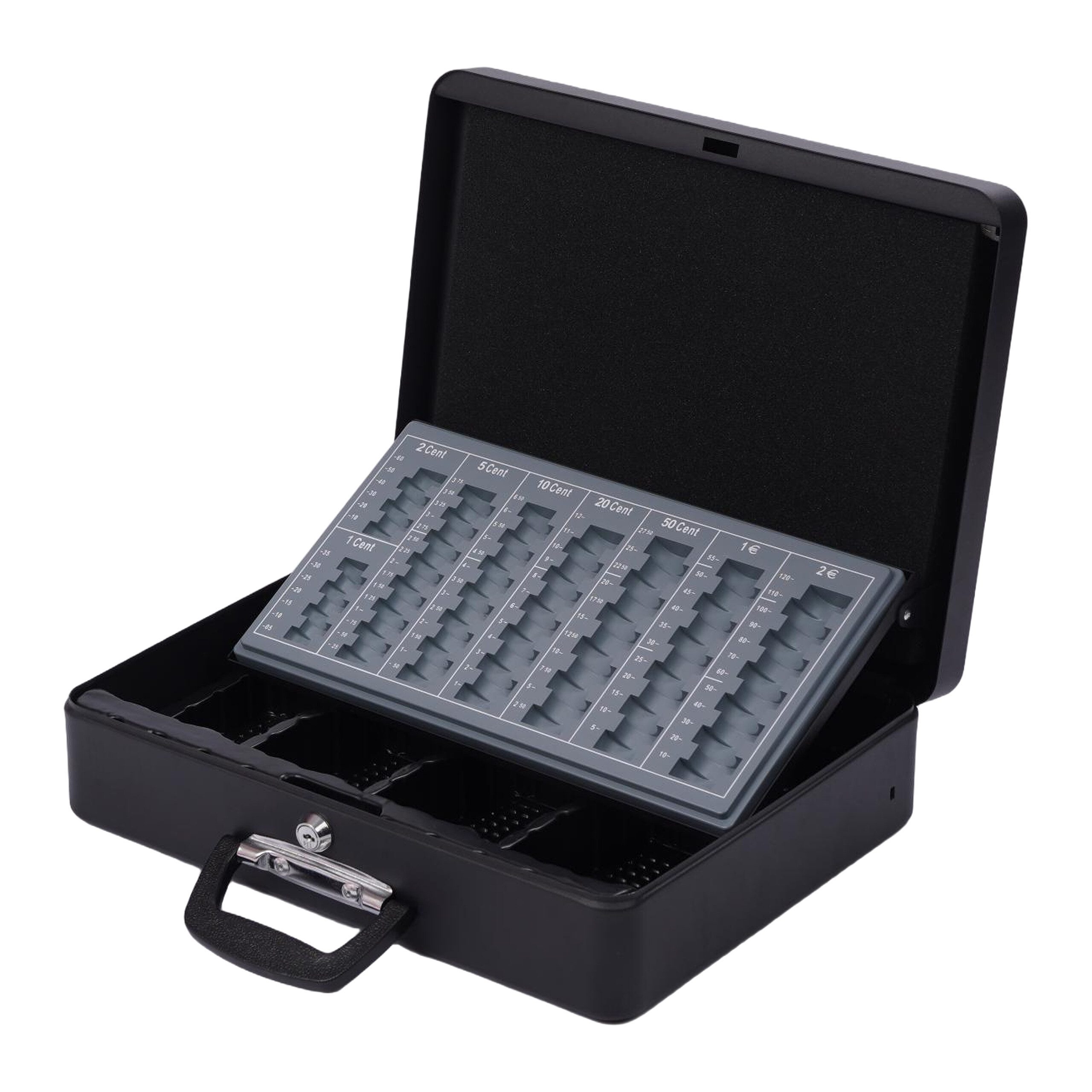 Wenn Du Bargeld sicher aufbewahren willst, ist diese robuste Geldkassette aus Eisen die ideale Lösung. Die abschließbare Handkasse mit 2 Schlüsseln eignet sich perfekt für Flohmärkte, Vereine oder den privaten Gebrauch. Im herausnehmbaren Einsatz mit 8 Münzfächern (1 Cent bis 2 €) und 4 Scheinunterteilungen behältst Du stets den Überblick. Der stabile Tragegriff der Metallkasse sorgt für einfachen Transport. Auch Wertsachen und Dokumente finden im geräumigen Innenraum Platz.