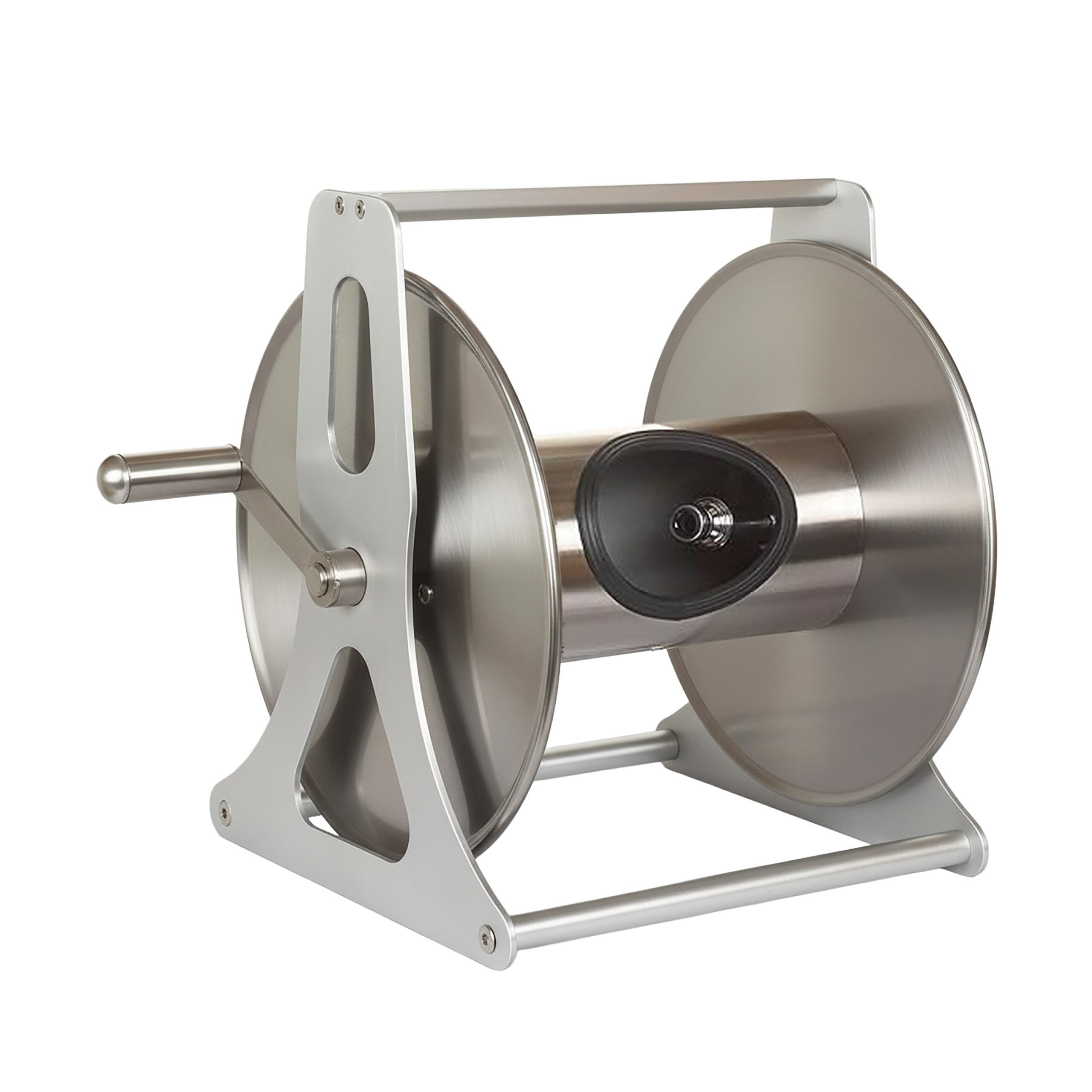 Schlauchtrommel im Detail - Maße H x B x T: ca. 31 x 50 x 36 cm - Anschluss: 3/4 Zoll - Für Schlauch: ca. 50 m (1/2 Zoll), 25 m (3/4 Zoll) - Gewicht: ca. 4 kg - Material: Edelstahl, Aluminium, Kupfer - Farbe: Silber