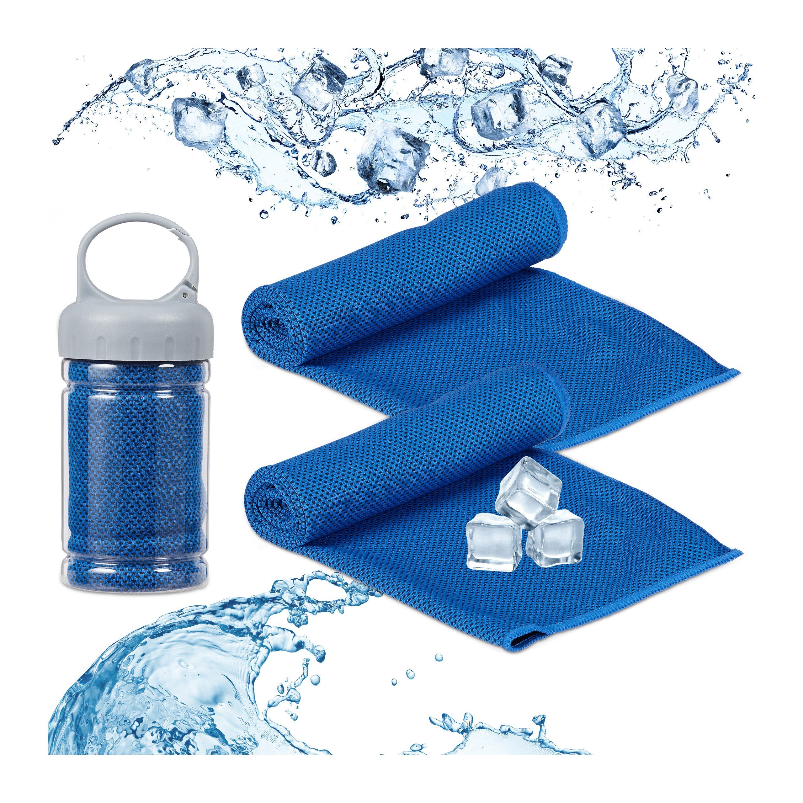 Mit diesen dünnen Kühltüchern unterstützen Sie sowohl bei Indoor- als auch Outdoor-Sportarten die natürliche Kühlung Ihres Körpers. Besonders im Sommer oder bei Sportarten, bei denen man schnell ins Schwitzen kommt, sorgt der kühlende Effekt der Handtücher für ein angenehmes Gefühl in Gesicht und Nacken, auf dem Kopf oder am Handgelenk. Dafür müssen die Handtücher lediglich nass gemacht werden. In der mitgelieferten Box mit Haken können Sie die Kühlhandtücher bequem transportieren.