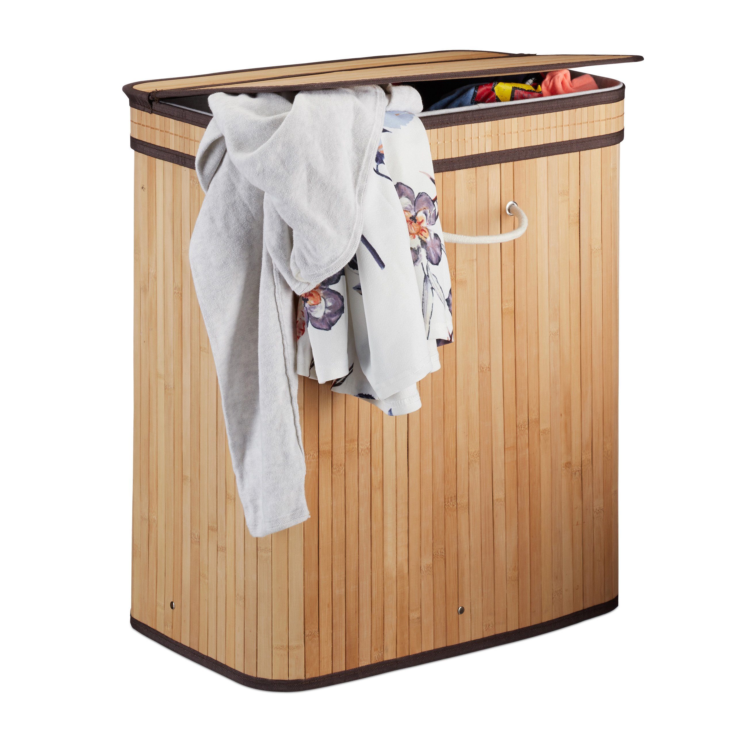 Mit dem Wäschesammler aus Bambus holen Sie sich ein praktisches und zugleich dekoratives Accessoire in Ihr Zuhause. Die Fertigung aus Bambus macht die Wäschetonne zum optimalen Möbel für Feuchträume. Die Wäschebox mit Klappdeckel verfügt über einen herausnehmbaren Wäschesack, der in zwei Kammern aufgeteilt ist. So haben Sie stets den Überblick über Ihre Wäsche und können bequem nach Farben oder Art der Kleidung sortieren. Bei Bedarf kann der Wäschetrenner zusammengefaltet und verstaut werden.
