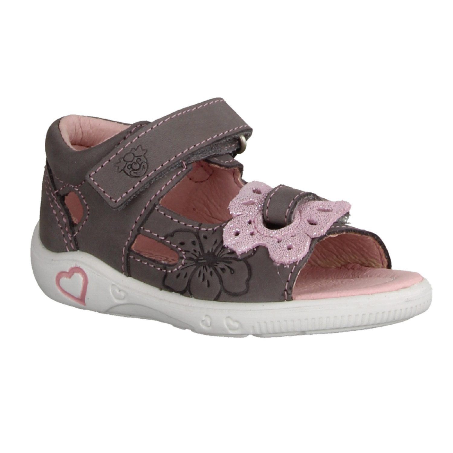 Die süßen Sandalen SILVI von PEPINO sind im Zehenbereich und am Oberfuß offen, die Ferse ist geschlossen. Das Obermaterial besteht aus echtem Leder und auch das Innenfutter und die Decksohle sind aus hochwertigem Leder gearbeitet. Im vorderen Seitenbereich wird der Kinderschuh von einer aufgeprägten Blüte geschmückt. Das Highlight ist jedoch der vordere Klettriegel oberhalb der Zehen, der durch einen aufgesetzten Schmetterling geführt wird. Der zweite Klettriegel über dem Spann ist mit dem Logo versehen. Als Laufsohle dient strapazierfähiges PU, verziert mit kleinen Herzchen. Die niedlichen Sandalen mit praktischem Klettverschluss werden in verschiedenen Farben angeboten.