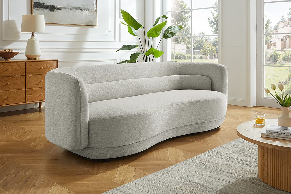 Die Polsterung mit Federkern und Schaum sorgt in Kombination mit einer stabilen Wellenunterfederung für besten Sitzkomfort und dauerhafte Formstabilität. Die rundumlaufende Rückenlehne mit dezentem Nahtdesign bietet angenehmen Halt, während die großzügige Sitzfläche zum Entspannen einlädt. Der hochwertige Chenillestoff fühlt sich angenehm weich an und setzt in jedem Raum einen eleganten Akzent. Perfekt kombinierbar mit hellen Holztönen, Messingdetails oder minimalistischer Deko. Mit dem Sofa GATSBY holst Du Dir ein stilvolles Statement-Stück in Deine vier Wände – komfortabel, hochwertig und von zeitloser Eleganz!