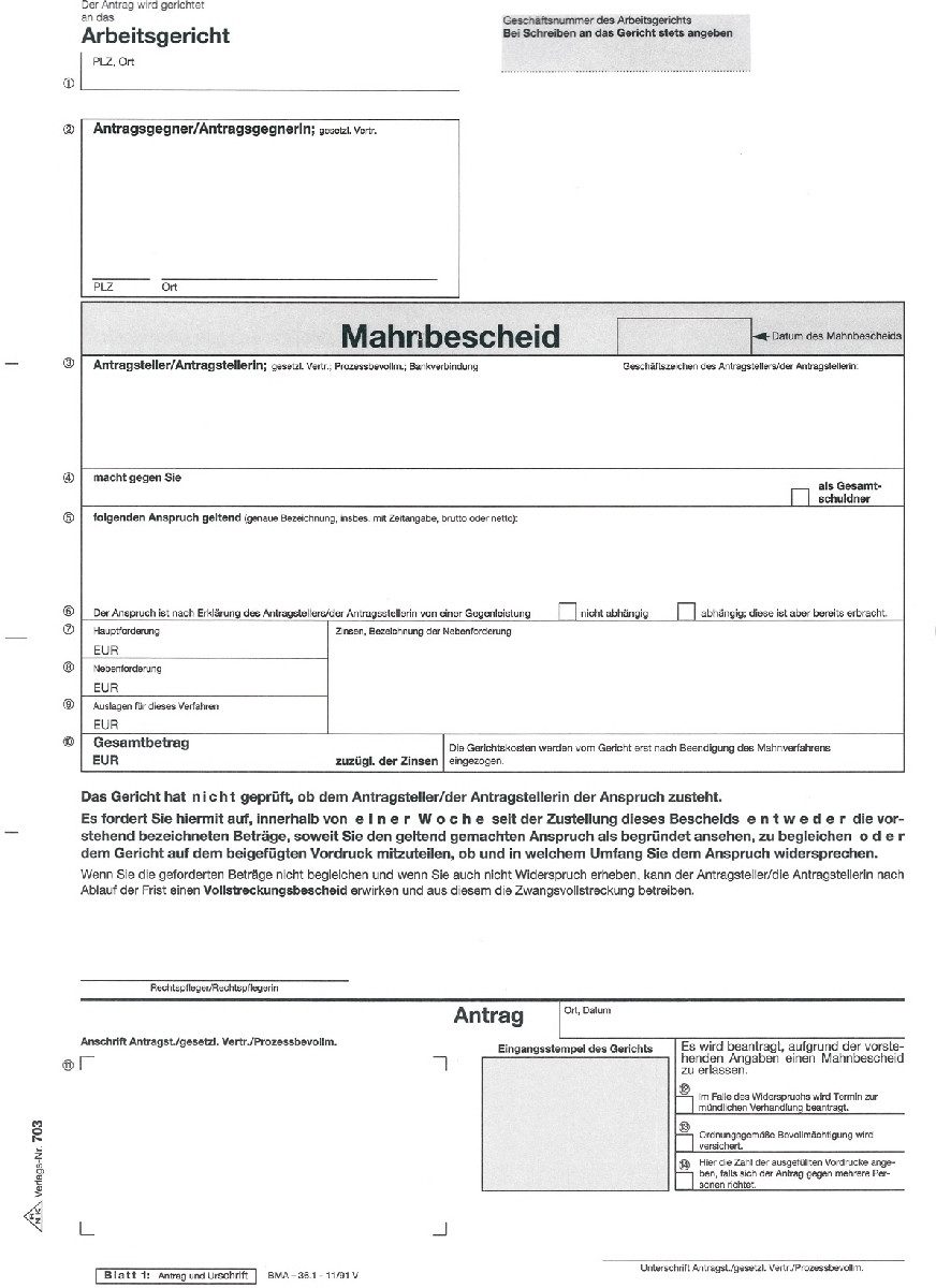 • Vordruck für den Mahn- und Vollstreckungsbescheid Arbeitsgericht DIN A4