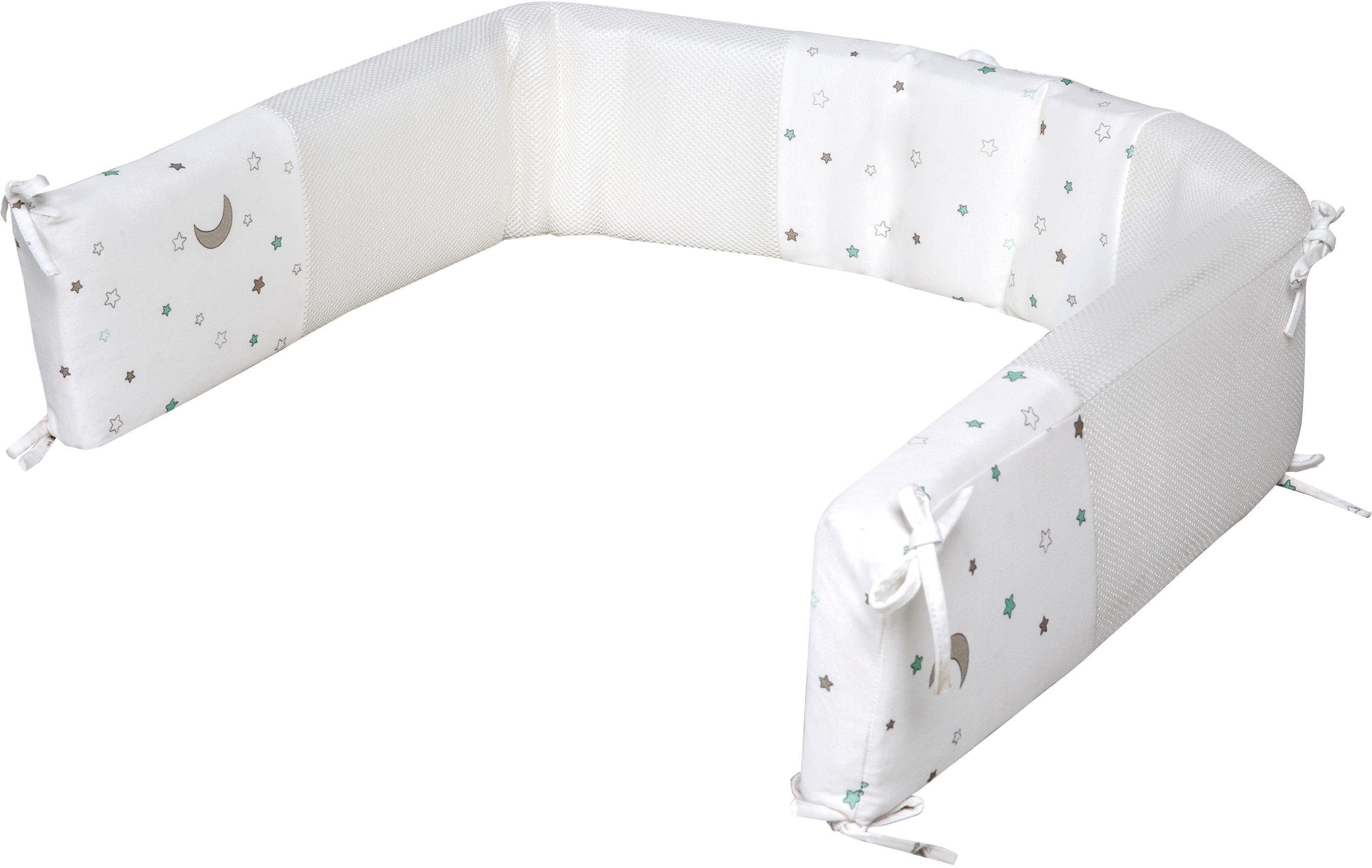Das roba Nestchen Air PLUS aus der Serie safe asleep® im niedlichen „Sternenzauber“-Design ist mit dem AIR-Balance System ausgestattet, das wie eine natürliche Klimaanlage wirkt. Das AIR-Balance System verbessert die natürliche Luftzirkulation und sorgt für einen Temperaturausgleich, wodurch ein gefährlicher Hitze- und Feuchtigkeitsstau vermieden wird. Das AIR-Balance System sorgt so für ein gesundes und angenehmes Wohlfühlklima. Das besonders luftdurchlässige atmungsaktive Mesh-Material des safe asleep® Nestchens vermindert die CO2-Rückatmung und ermöglicht eine optimale Luftzufuhr, wodurch die Gefahr einer Überhitzung minimiert wird. Zusätzlich polstert das flache Nestchen die Gitterstäbe im Kopfbereich des Babybettchens ab und sorgt dafür, dass die kleinen Gliedmaßen des Babys im Inneren des Bettchens bleiben. Das safe asleep® Nestchen kann mit Stoffbändern am Babybett fixiert werden, so dass Ihr Baby sich darin weder einwickeln noch damit bedecken kann. Das roba Nestchen Air PLUS ist besonders flach und weich gepolstert. Mit dem safe asleep® Nestchen fühlen sich Babys geborgen und können sicher und gesund schlafen. Das Nestchen Air PLUS ist 170 cm breit, 16 cm hoch und 4 cm tief, passend für Babybetten 60 cm x 120 cm oder 70 cm x 140 cm. Material: Mesh (100% Polyester) und Jersey (100% Baumwolle), Füllung 100% Polyester, Bezug abnehmbar und waschbar, mit Reißverschluss (ohne Griff).