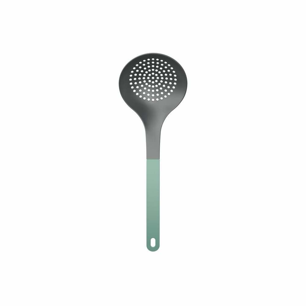 Großer Schaumlöffel mit farbigem Griff. Der Schaumlöffel ist unverzichtbar, wenn Sie Fleisch oder Gemüse aus einem Topf oder einer Pfanne nehmen möchten, ohne die Flüssigkeit zu verschütten. Aus Nylon, das beschichtete Töpfe und Pfannen schont und bis 220 Grad Celsius hitzebeständig ist. Schönes, ergonomisches Design mit praktischem Aufhängeloch. Spülmaschinenfest. 32 cm.