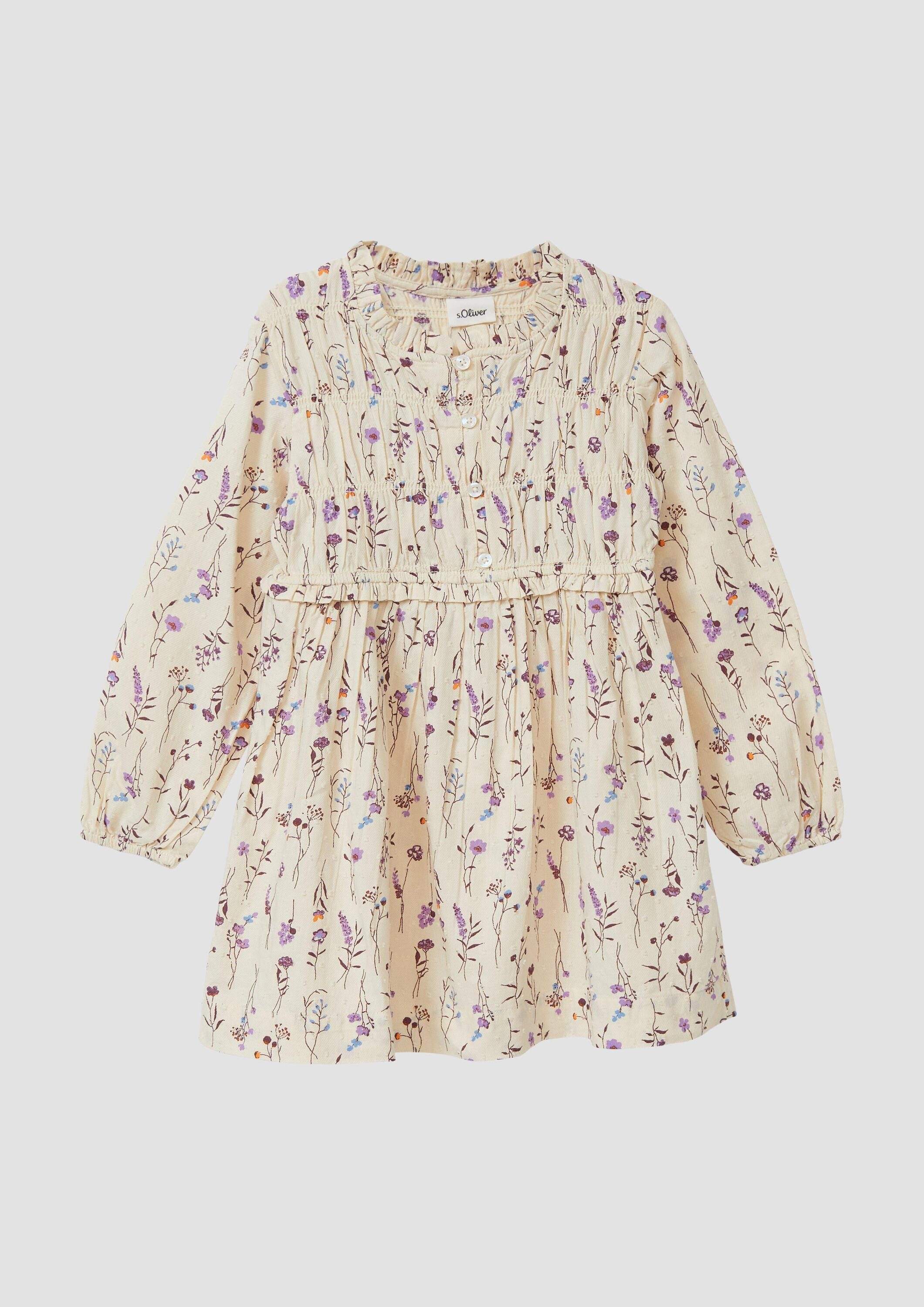 | Schnittform Länge | Floral bedrucktes Webkleid mit Raffungen und Knopfleiste |