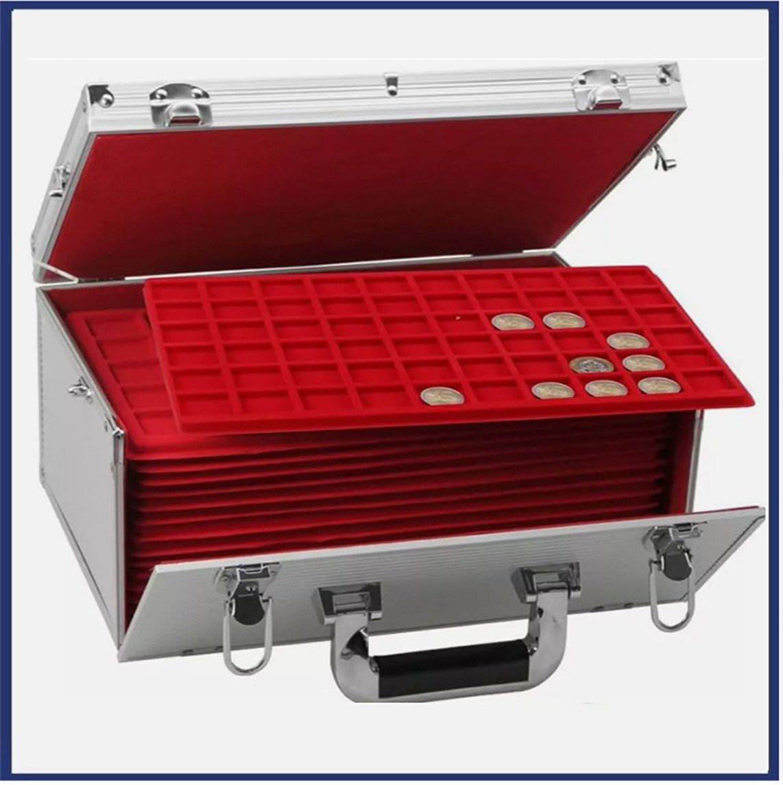 Die komplett aufklappbare Frontklappe sorgt für einen schnellen und einfachen Zugriff auf Ihre Sammlung. Der Innenraum ist mit edlem rotem Samt ausgekleidet, der Ihre Münzen optimal schützt. Zudem bietet der Koffer eine besonders stabile Bauweise mit verstärkten Ecken und Kanten, zwei abschließbaren Schlössern und einem robusten Tragegriff für sicheren Transport.