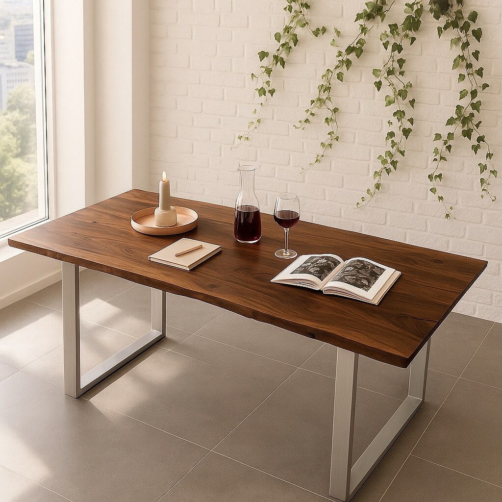 Der Esstisch Kapalua besteht aus einer Massivholztischplatte mit Baumkante und einem eleganten Tischgestell. Massivholz ist belastbar und wohnlich zugleich und passt in nahezu jeden Einrichtungsstil.