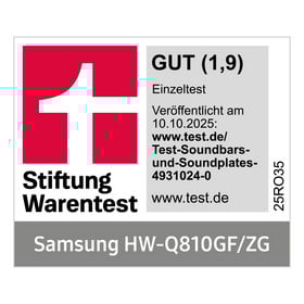 Das Onlinemagazin der „Stiftung Warentest“ testet die Samsung HW-Q810GF/ZG im Einzeltest. Das „gute“ Ton überzeugt. Die einfache Handhabung punktet u. a. mit „guter“ Bedienung, „guten“ Anzeigen und einer „sehr guten“ Startdauer aus dem Standby. Außerdem verbraucht das Modell sehr wenig Strom. Die Soundbar erreicht das Gesamtergebnis „GUT (1,9).