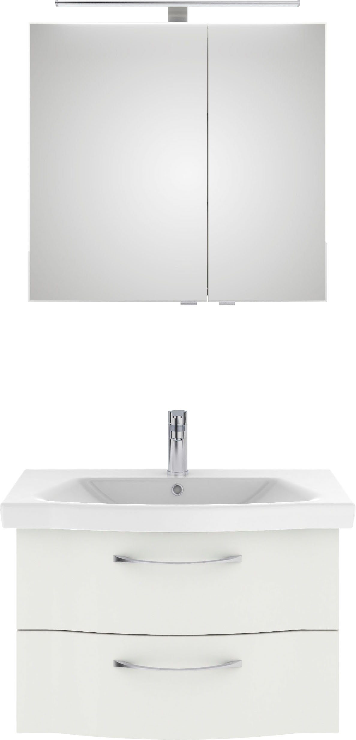| Funktionen | 1 Keramikwaschtisch weiß 1 LED-Aufsatzleuchte 1 Spiegelschrank mit 2 Drehtüren 1 Waschtischunterschrank mit 2 Auszügen |