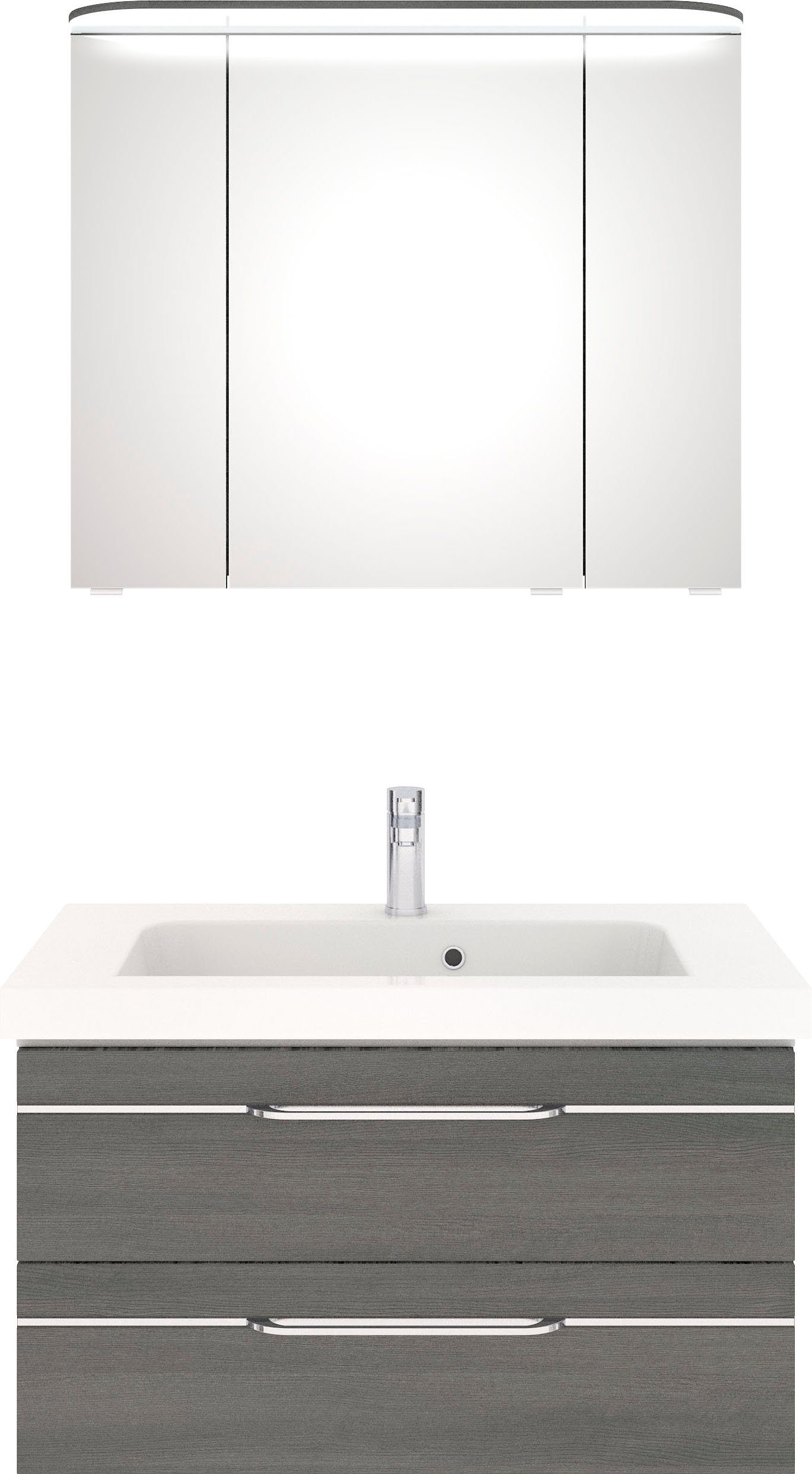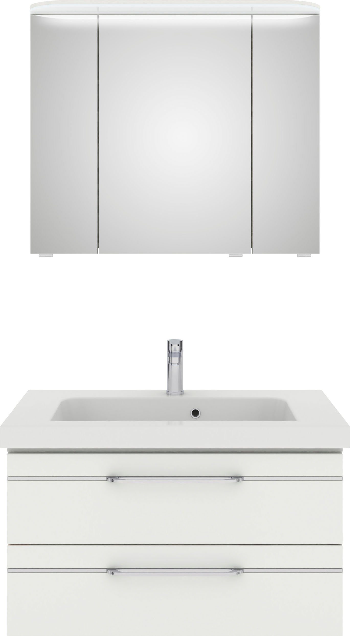 | Funktionen | 1 LED-Lichtkranz 1 Mineralmarmor-Waschtisch weiß 1 Spiegelschrank mit 3 Drehtüren 1 Waschtischunterschrank mit 2 Auszügen |
