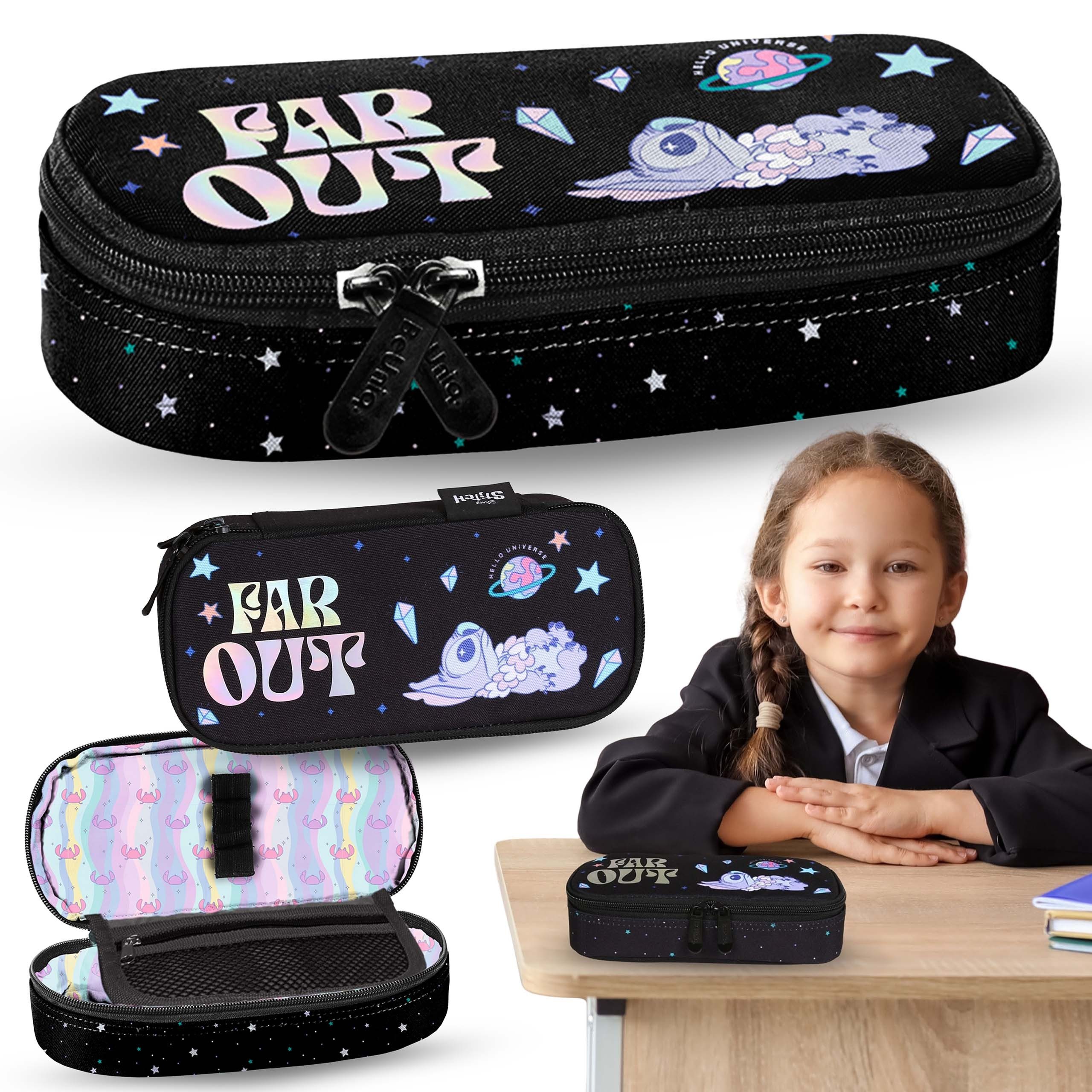 Das ovale Mäppchen Stitch PASO ist ein praktisches und stilvolles Schulaccessoire mit einem kosmischen Touch.