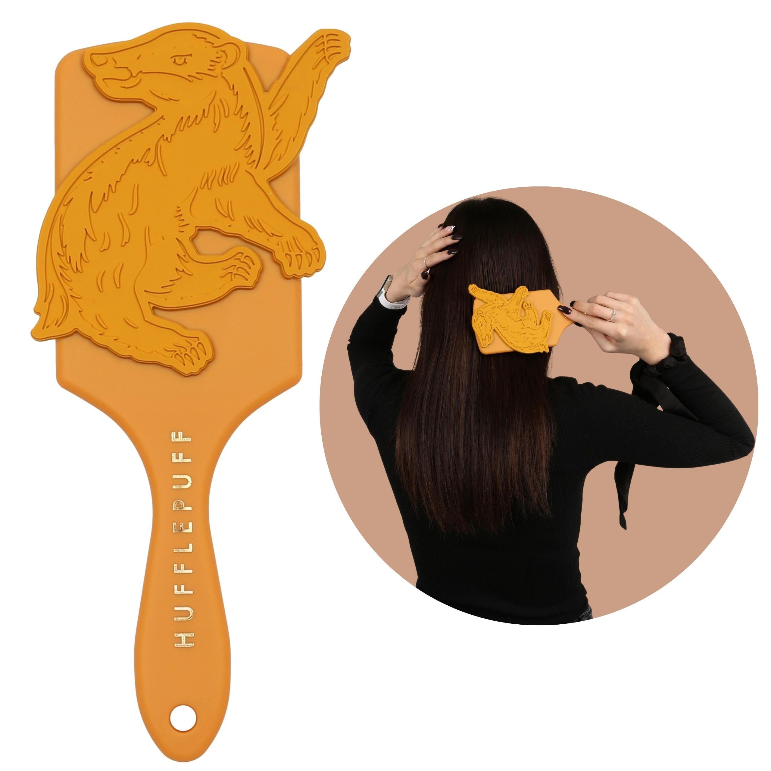 Senffarbene Haarbürste, auf der Rückseite mit einer Gummiapplikation, die einen Dachs darstellt - das Symbol eines der Häuser von Hogwarts-Hufflepuff.