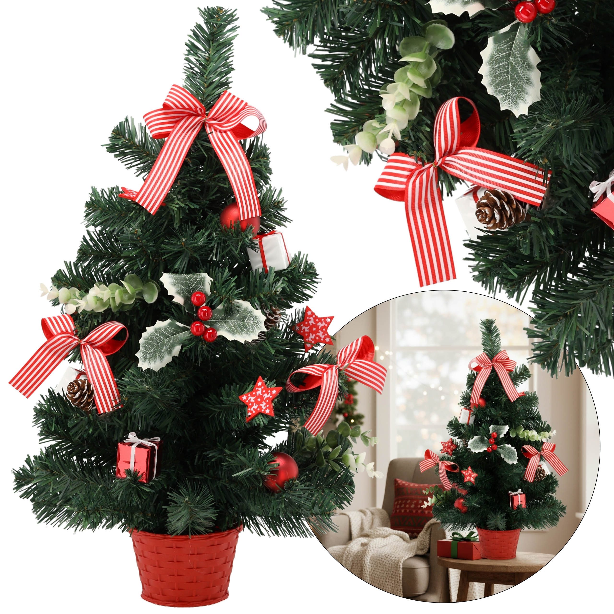 Der 60 cm hohe Weihnachtsbaum ist eine kompakte Dekoration, die sich ideal für den Schreibtisch, die Kommode oder den Tisch eignet.
