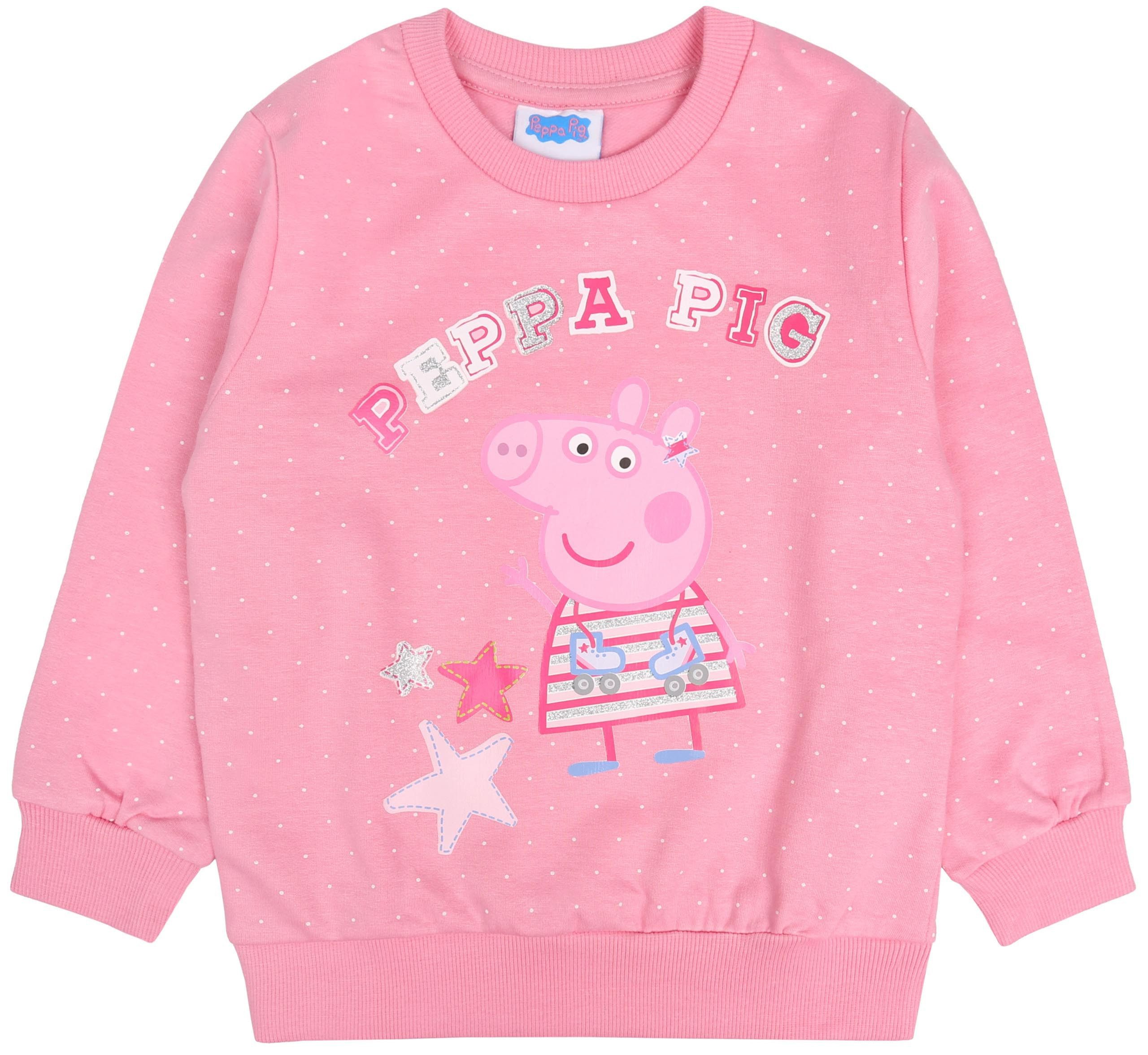 Pinker Pullover, über den Kopf angezogen mit sich wiederholenden Tupfen, vorne mit Abbildung von Peppa Wutz.