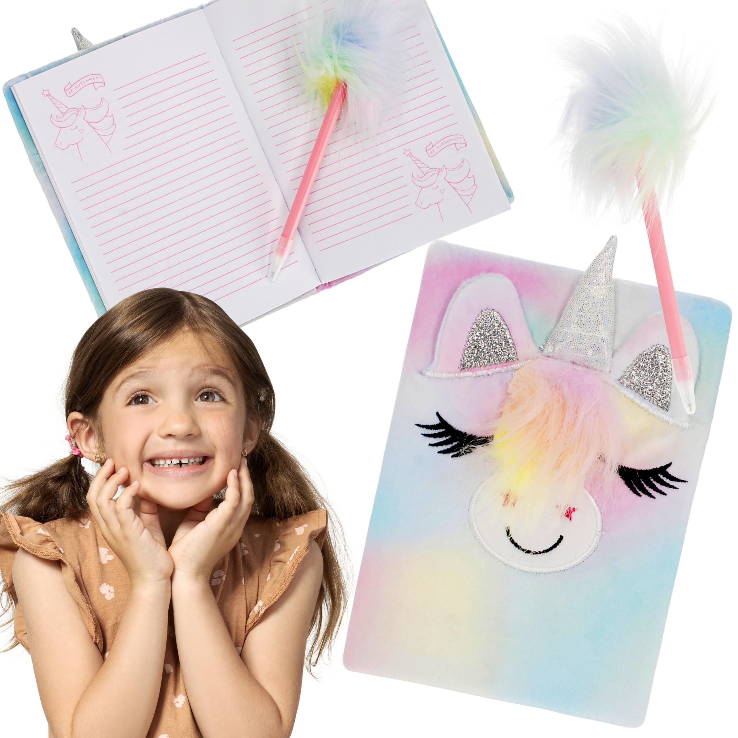 Tagebuch in einem farbenfrohen Plüscheinband mit dem Bild eines Einhorns im Set mit einem Kugelschreiber.
