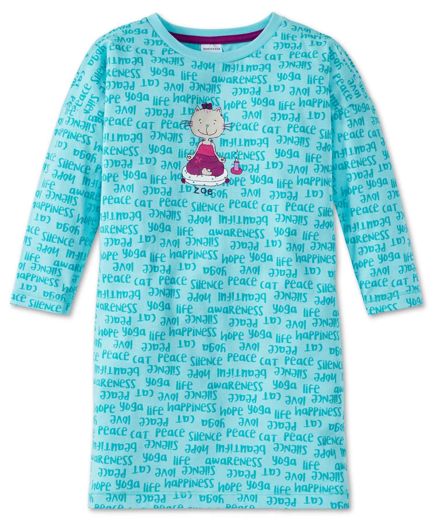 In diesem langärmeligen Nachthemd können es sich fröhliche Mädchen wunderbar bequem machen! Unser Yoga Kätzchen Zoe meditiert in entspannter Pose auf einem hübschen Kissen und wird von tonalen Yoga-Begriffen sowie glänzenden Abschlüssen fein umringt. Die moderne Schnittform mit überschnittenen Schultern und feiner Single Jersey aus 100% Baumwolle machen das Sleepshirt besonders gemütlich und versprechen süße Träume in bester SCHIESSER-Qualität. In moderner Schnittform mit überschnittenen Schultern, mit tonalen Yoga-Schriftzügen "yoga, cat, peace, love, hope, silence, beautiful", Yoga Cat Zoe in Meditations-Pose auf einem weichen Kissen und Schriftzug "Zoe" in Violett, violettes Band im Innenkragen und Glanzgarn an den Arm- und Saumbschlüssen, in weicher Single-Jersey-Qualität.