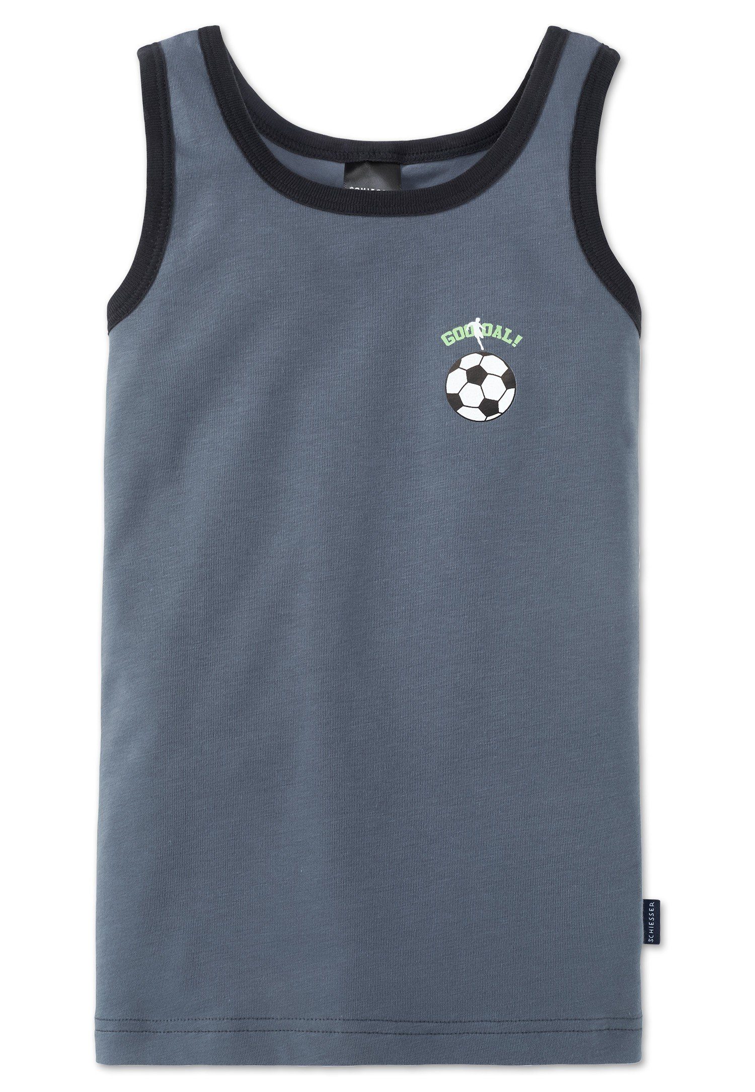 Mit kleinem Fußball auf der Brust und grünem Schriftzug "Goooal!", schwarzer Einfass an den Arm- und Halsausschnitten, kleines, dunkelblaues SCHIESSER-Flag an der Seitennaht, in herrlich bequemer, elastischer Single-Jersey-Qualität.