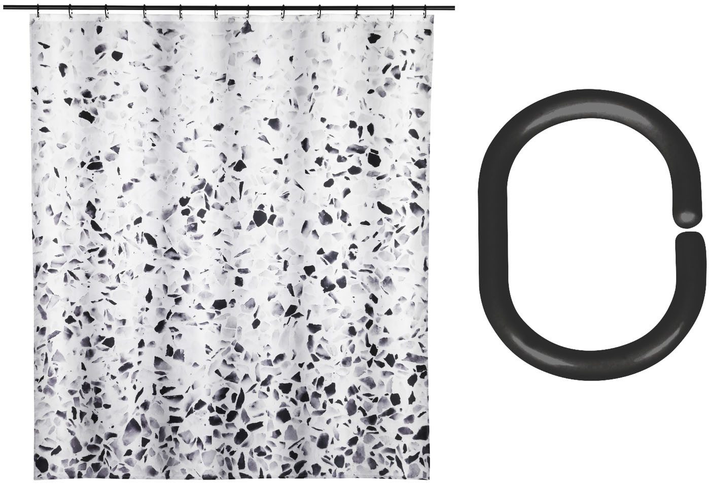 Der Duschvorhang Tosi sorgt mit seinem Terrazzo-Muster für ein mediterranes Flair im Bad, hält sich durch seine schwarz-weiße Farbgebung mit natürlichen Momenten jedoch stets elegant zurück. Gleichzeitig zieht ein Stück mehr in Ihr Zuhause ein: Der Textil-Vorhang besteht zu 100 % aus GRS-zertifiziertem Polyester, das aus recycelten PET-Flaschen gewonnen wurde. Ein echter Gewinn für Sie!