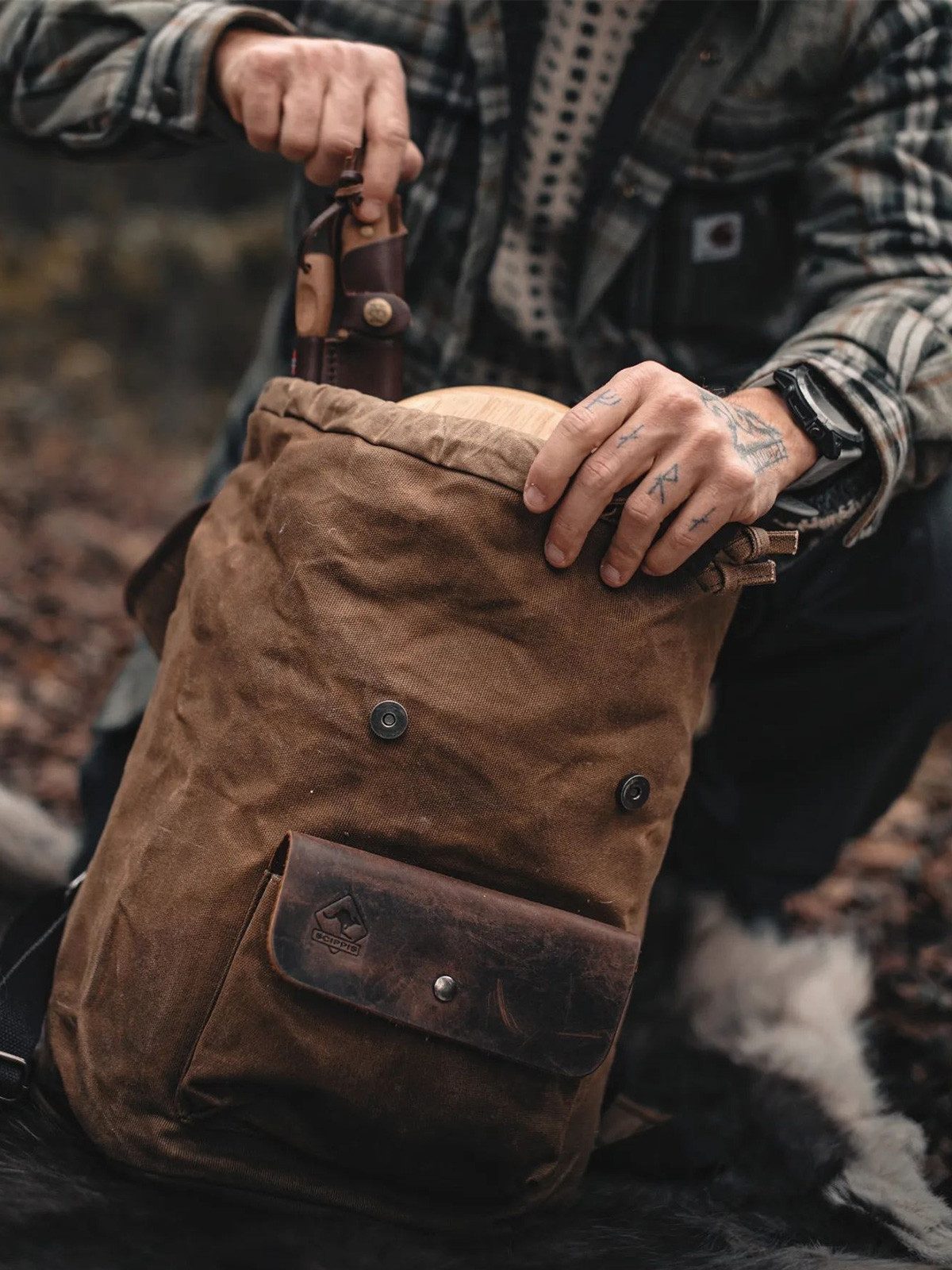 Robustes, gewachstes Canvas mit dunkelbraunen Lederdetails
