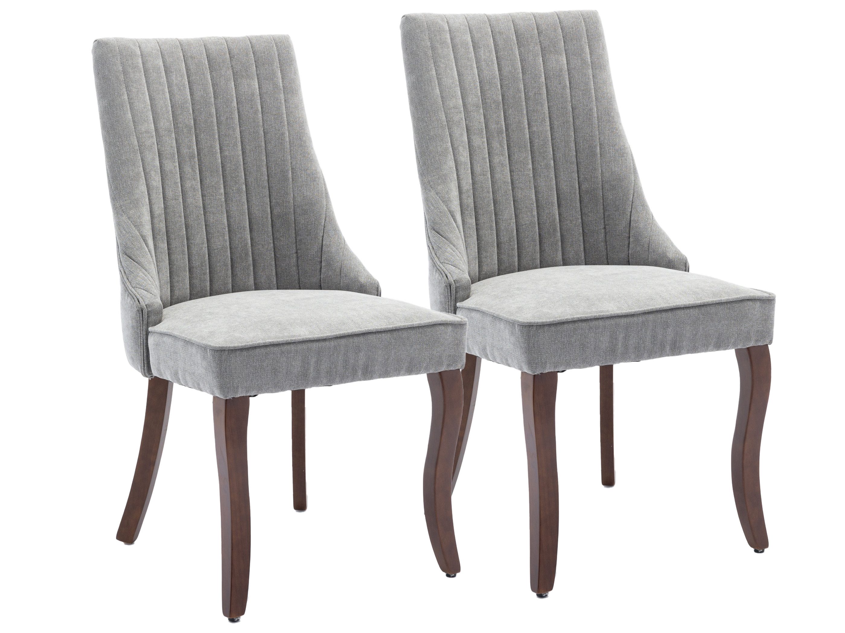 Dieses 2er Set Esszimmerstühle verbindet elegantes Design mit hohem Sitzkomfort. Der weiche Chenille-Bezug, kombiniert mit einer Polsterung aus hochdichtem Schwamm und Federkern, macht die Sitzfläche besonders bequem. Die hohe, geschwungene Rückenlehne unterstützt den Rücken und verleiht zusätzlichen Halt, während die leicht aussparende Partie im unteren Bereich die Sitztiefe erweitert und so ein noch entspannteres Sitzgefühl schafft. Die stabilen Massivholzfüße, mit geschwungenem Design an der Rückseite und wellenförmigen Linien an der Vorderseite, unterstreichen die stilvolle Ausstrahlung der Stühle. Verstellbare Fußpads sorgen für einen sicheren Stand, auch auf unebenen Böden. Dank der einfachen Montage sind die Stühle in wenigen Minuten einsatzbereit und bereichern Ihr Esszimmer mit Komfort und Eleganz.