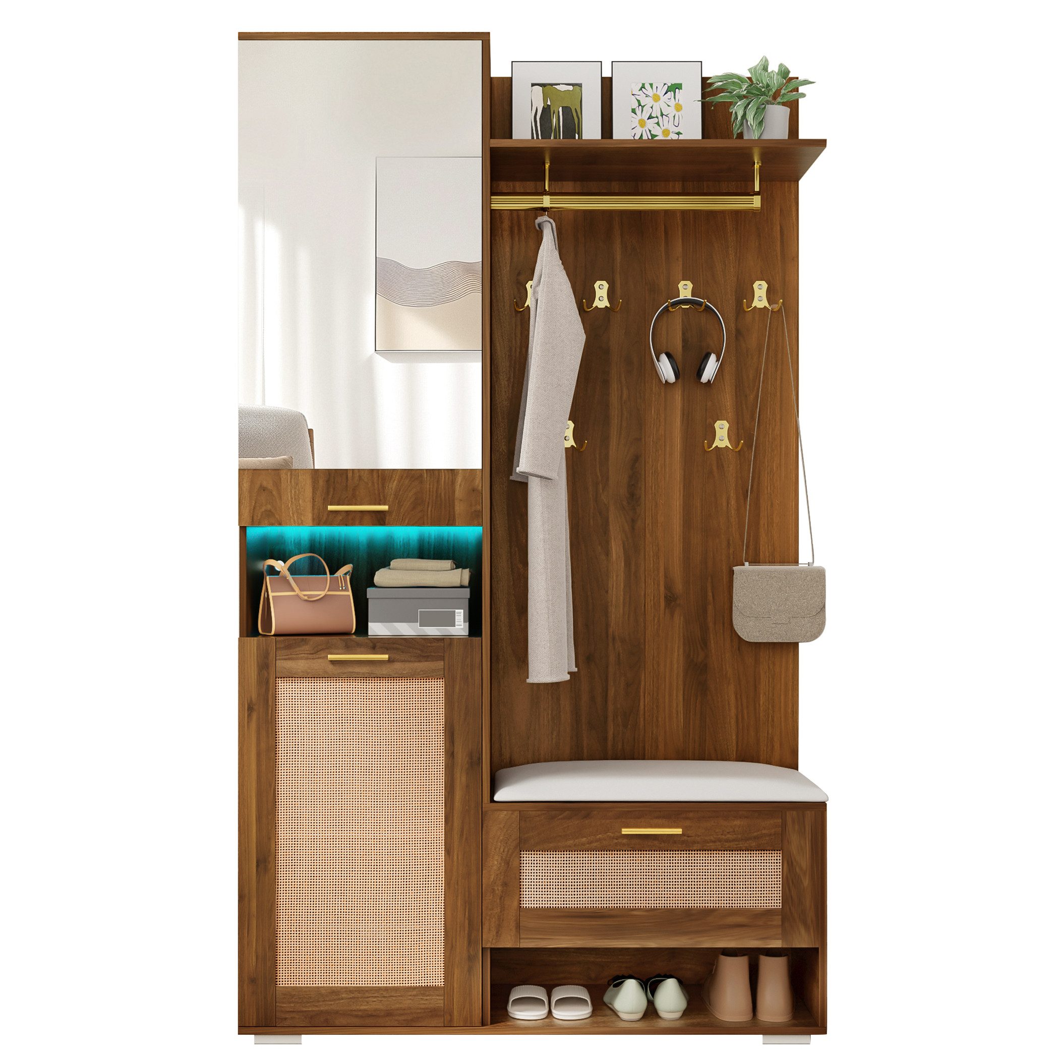 Diese moderne Garderobe vereint Stil und Funktion in perfekter Harmonie. Mit Spiegel, LED-Beleuchtung und charmanten Rattanfronten wird sie zum Blickfang in jedem Flur. Die Kombination aus offenen und geschlossenen Fächern, Kleiderstange, Doppelhaken und Sitzbank bietet großzügigen Stauraum für Jacken, Schuhe und Accessoires. Verstellbare Einlegeböden ermöglichen individuelle Organisation, während die gepolsterte Sitzbank bequemen Komfort beim Anziehen bietet. Ein Möbelstück, das Ordnung, Stil und Wohnlichkeit in Ihren Eingangsbereich bringt.