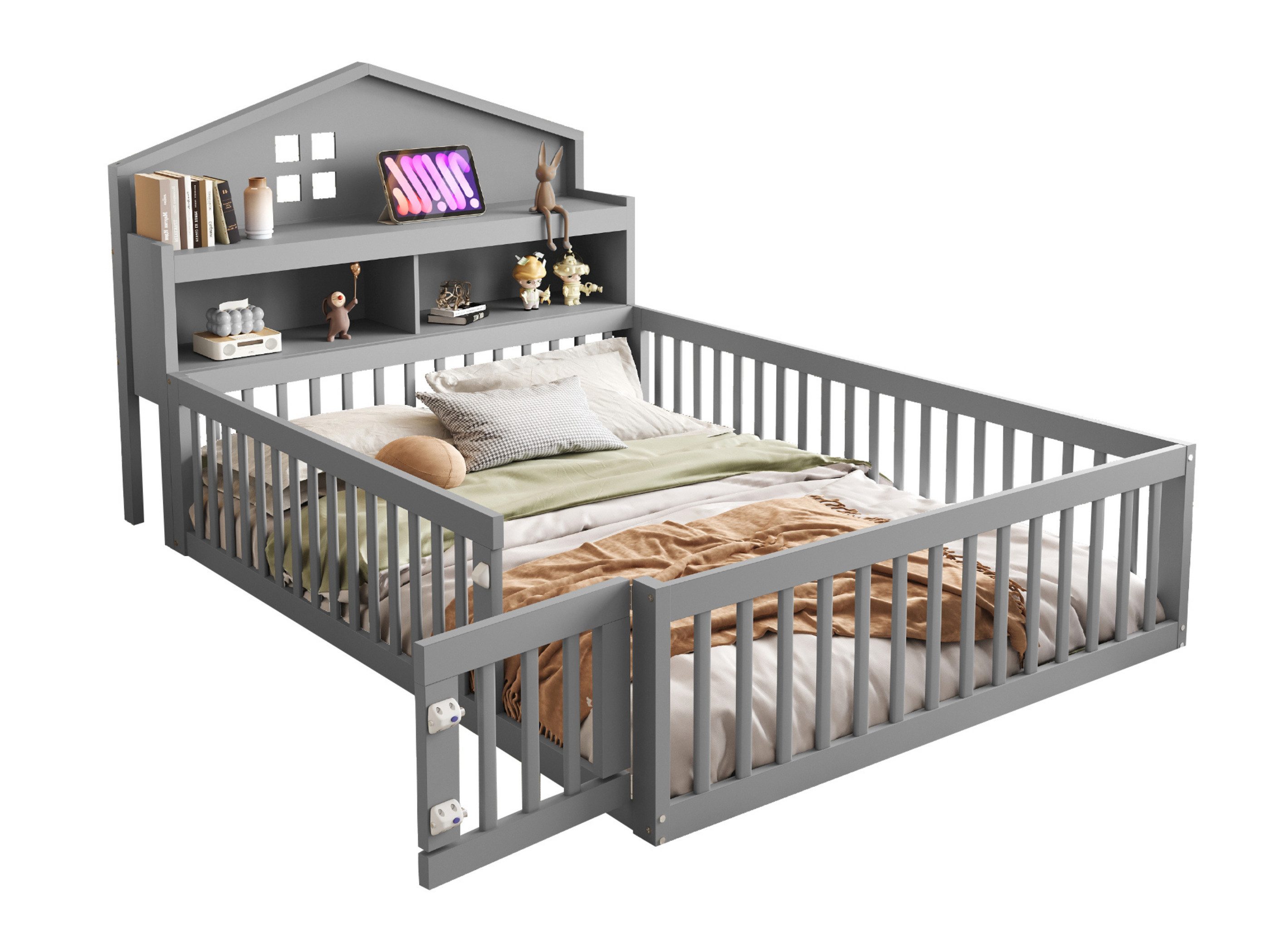 Dieses Holzbett für Kinder vereint Kreativität und Funktionalität. Das Kopfteil ist in Form eines Hauses gestaltet und verfügt über zwei Regale (28,5 cm breit). Auf dem Kopfteil befindet sich eine Tafel, auf der Kinder frei kritzeln oder kleine Notizen machen können. Der 40 cm hohe Umzäunung sorgt für Sicherheit, ohne den Spielraum einzuschränken, und die 140x200 cm große Liegefläche bietet ausreichend Komfort. Das bodenständige Design mit niedrigem Schwerpunkt erhöht die Stabilität des Bettes, und das sanft designte Türschloss verhindert, dass Kinder sich verletzen. Das gesamte Design ist sowohl sicher als auch verspielt und stellt die ideale Wahl für ein Kinderbett dar.