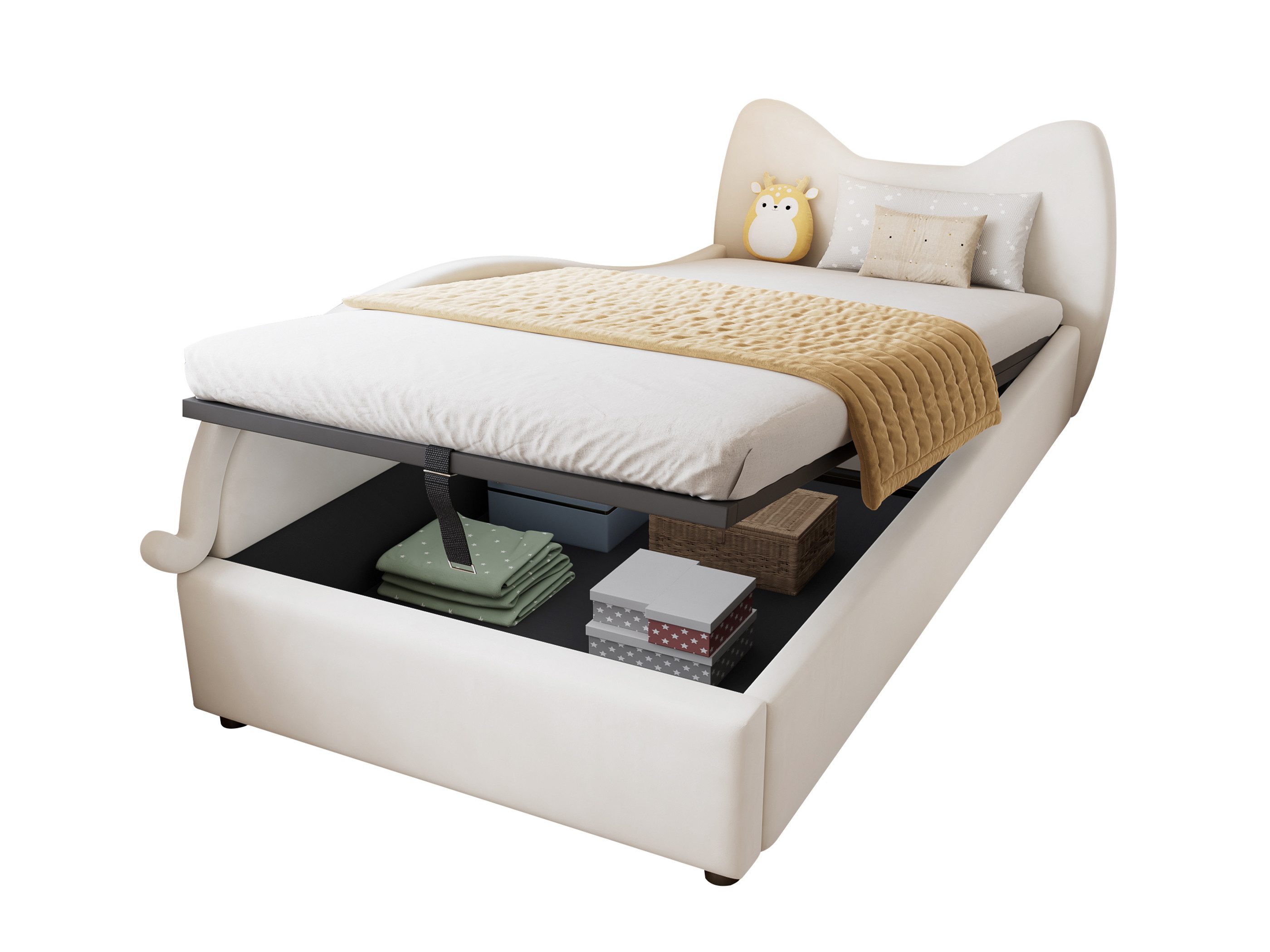 Dieses liebevoll designte Polsterbett mit Samtbezug kombiniert spielerisches Design mit durchdachter Funktionalität. Das markante Katzenohren-Kopfteil verleiht dem Bett einen einzigartigen Charakter, während der weiche Samtbezug für luxuriösen Komfort sorgt. Das seitliche Schutzgeländer mit wellenförmigem Verlauf bietet zusätzliche Sicherheit, ideal für Kinder und Jugendliche. Unter der Liegefläche verbirgt sich ein großzügiger Stauraum, der sich dank hydraulischer Hebemechanik und Zugband mühelos öffnen lässt. Stabile Lattenroste und solide Stützfüße garantieren eine hohe Belastbarkeit und Langlebigkeit. Ein stilvolles und praktisches Möbelstück, das jeden Schlafraum bereichert.