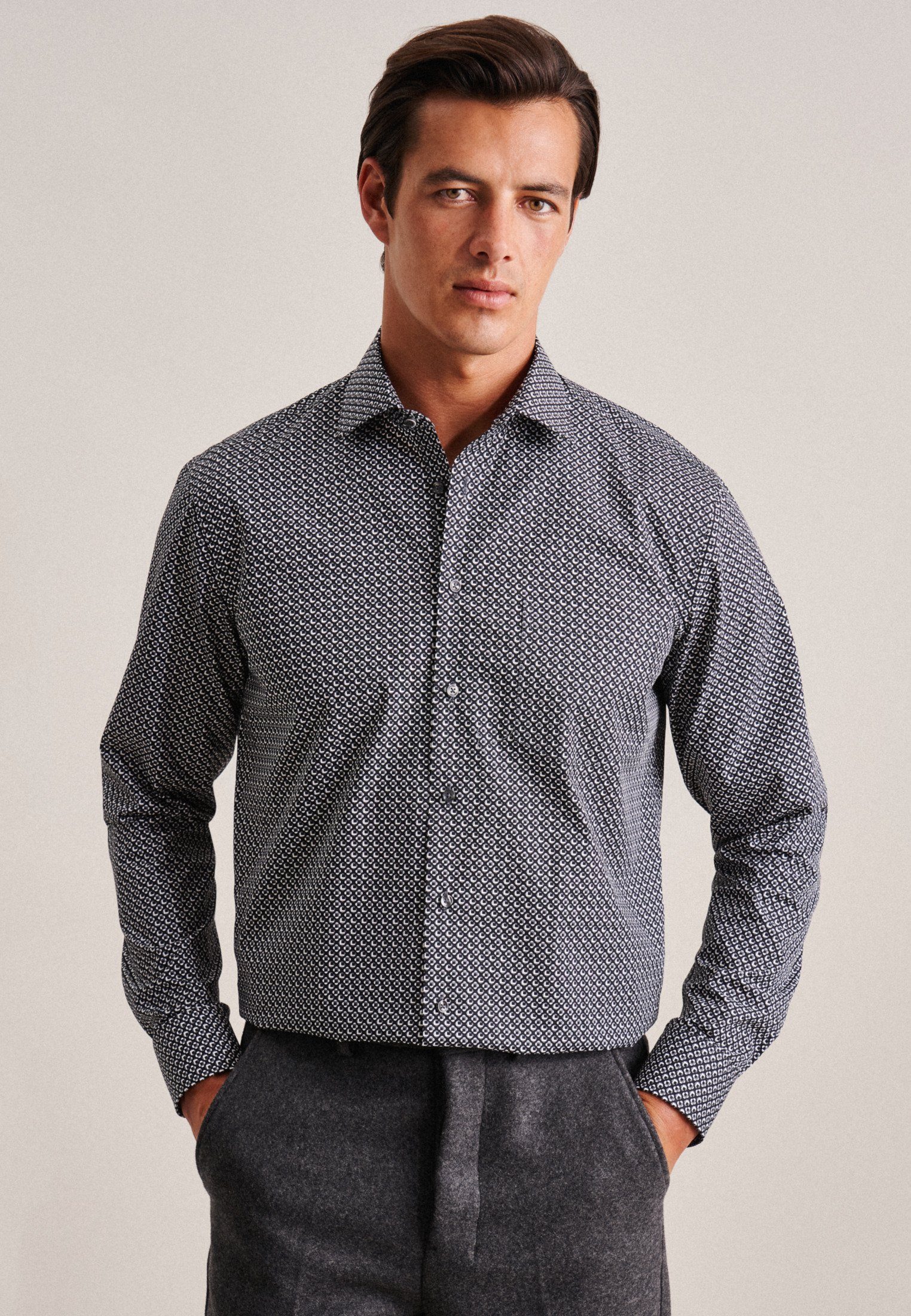 Maskuline Ästhetik: Das Business Hemd von Seidensticker aus der "SMART ESSENTIALS" Kollektion erweitert Ihre Garderobe um einen hochwertigen Look, der den Geist der Zeit trifft. Es ist ein vielseitiger Begleiter, der sich ideal für Freizeit, Büro, Veranstaltungen oder Homeoffice eignet und überall überzeugt. Der mit hoher Dichte gewebte und somit besonders widerstandsfähige Popeline-Stoff ist aus 100% Baumwolle - perfekt für pflegeleichte Outfits. Durch seinen Schnitt in Regular fit liegt das Business Hemd nicht so eng und eher leger an und schafft so einen optimalen Komfort beim Tragen. Das charakteristische Druck-Muster macht es zu einem absoluten Must-have. Dieses Hemd verkörpert zeitlose Eleganz mit modernem Stil. Für Liebhaber von eleganten Looks ist dieses Langarm-Business Hemd eine sehr gute Wahl. Es wird durch weitenverstellbare Manschetten ergänzt. Hervorragend unterstrichen wird der universelle Business-Charakter durch einen Kentkragen. Als dezentes Detail ist zudem eine Brusttasche verarbeitet worden.