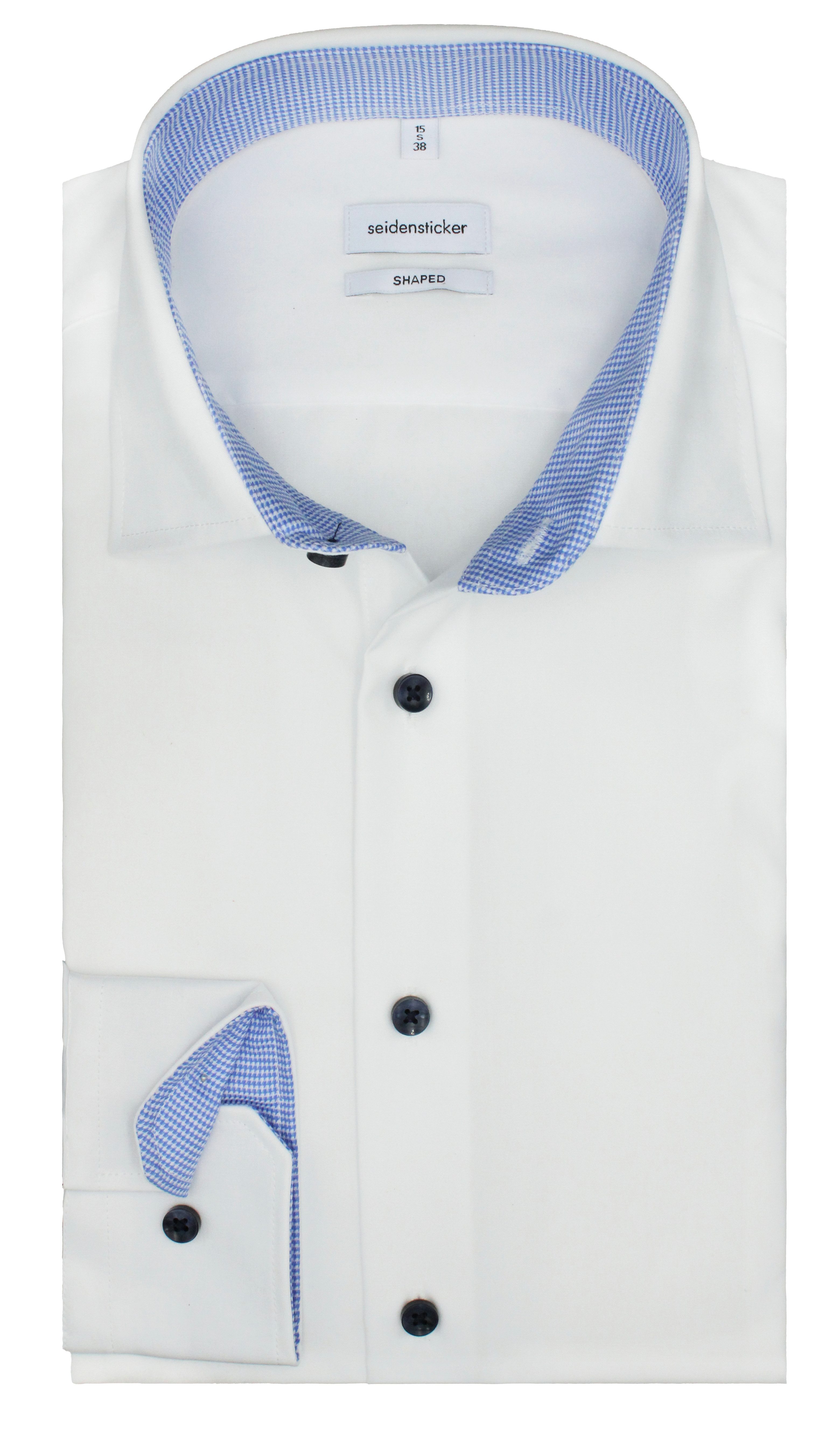Modernes Design trifft auf klassische Eleganz: Das Seidensticker Businesshemd in Shaped vereint stilvolle Schlichtheit mit einem raffinierten Detail – dem feinen, blauen Kontrastmuster im Krageninnenbereich und an den Manschetten. Dieses Hemd ist die perfekte Wahl für modebewusste Männer, die im Büro, bei festlichen Anlässen oder im Alltag stilvoll auftreten möchten.