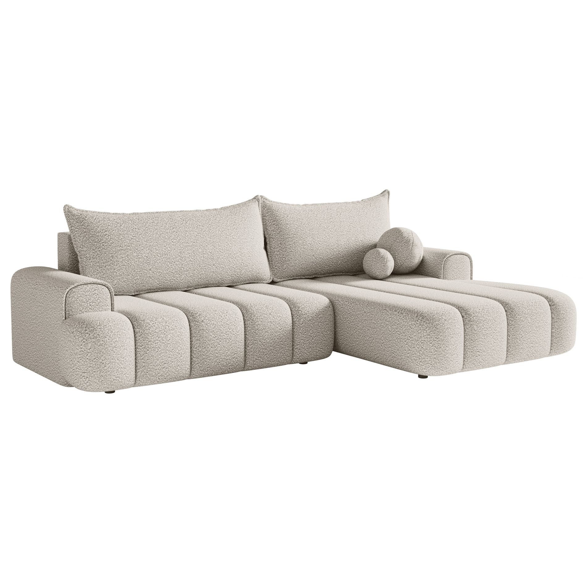 Bouclé-Stoff "Loop" – Ein hochwertiger, strukturierter Stoff, der sich durch seine außergewöhnliche Langlebigkeit und pflegeleichte Eigenschaften auszeichnet. Seine besondere Haptik verleiht dem Sofa einen modernen, gemütlichen Look. Perfekt für alle, die eine elegante, aber strapazierfähige Oberfläche suchen.