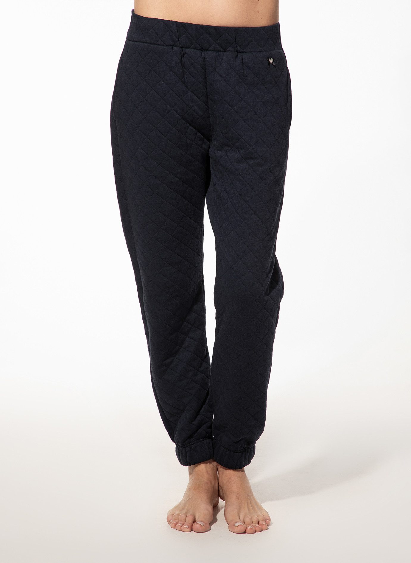 Diese dunkelblaue Damen-Sweathose von SHORT STORIES aus Double-Face-Material mit eleganter Rautenstruktur vereint Stil, Komfort und Nachhaltigkeit.Hergestellt aus 76% Bio-Baumwolle und 24% recyceltem Polyester bietet sie ein weiches, angenehmes Tragegefühl. Der elastische Gummibund sorgt für optimalen Sitz, während praktische Hosentaschen zusätzlichen Komfort bieten. Die unten gerafften Beine verleihen der Hose eine moderne Silhouette, und die Schleife mit Herzmedaillon am Taillenbund setzt einen femininen Akzent. Perfekt für entspannte Stunden zu Hause oder als stilvolles Loungewear-Piece. Die passende Sweatjacke ist im SHORT STORIES Onlineshop erhältlich. - Unser Model trägt Größe S - Dunkelblaue Damen-Sweathose aus Double-Face-Material mit Rautenstruktur - 76% Bio-Baumwolle, 24% recyceltes Polyester - Elastischer Gummibund - Praktische Hosentaschen - Maschinenwäsche bei 40°C, nicht trocknergeeignet