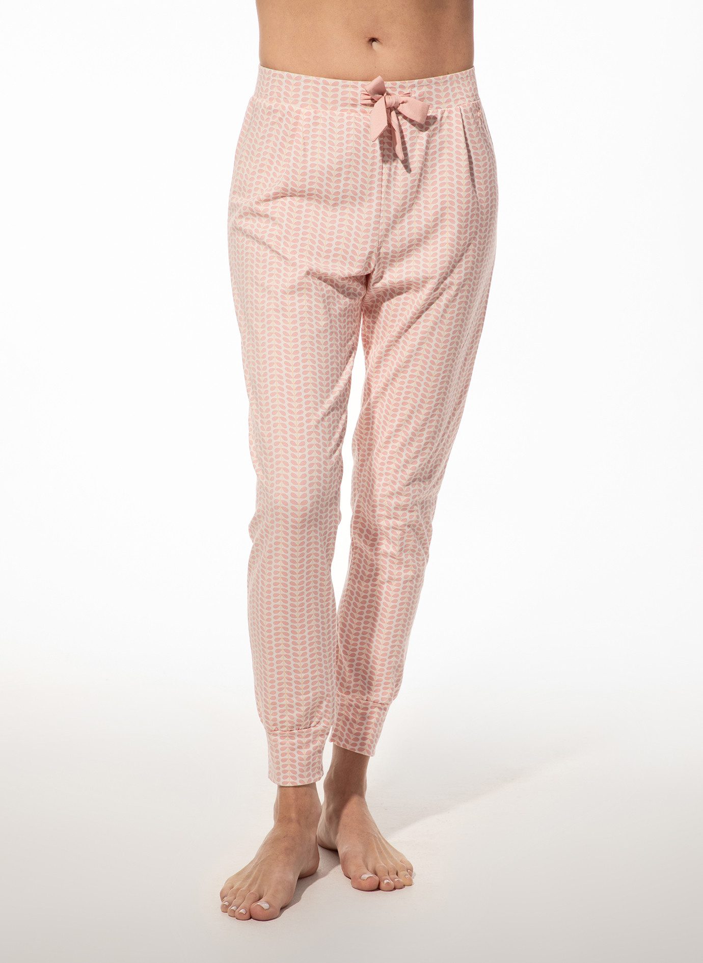 Diese wunderschöne Damen-Schlafhose von SHORT STORIES begeistert mit einem abstrakten Muster in zartem Rosa und einem femininen, modernen Look. Der elastische Taillenbund ist mit einer auffälligen Zierschleife im passenden Rosaton versehen und sorgt für optimalen Tragekomfort. Elegante Kellerfalten am Bund verleihen der Hose einen fließenden Fall, während die feinen, breiten Beinbündchen den stilvollen Auftritt unterstreichen. Die schmalere Passform betont sanft die Silhouette und macht diese lange Schlafhose zu einem perfekten Begleiter für entspannte Abende mit modischem Anspruch. - unser Model trägt Größe S - 47% Baumwolle, 47% Modal, 6% Elasthan - Damen-Schlafhose lang - abstraktes Muster - Zierschleife am Taillenbund - eng zulaufende Schnittform - Maschinenwäsche bei 40°C, nicht trocknergeeignet