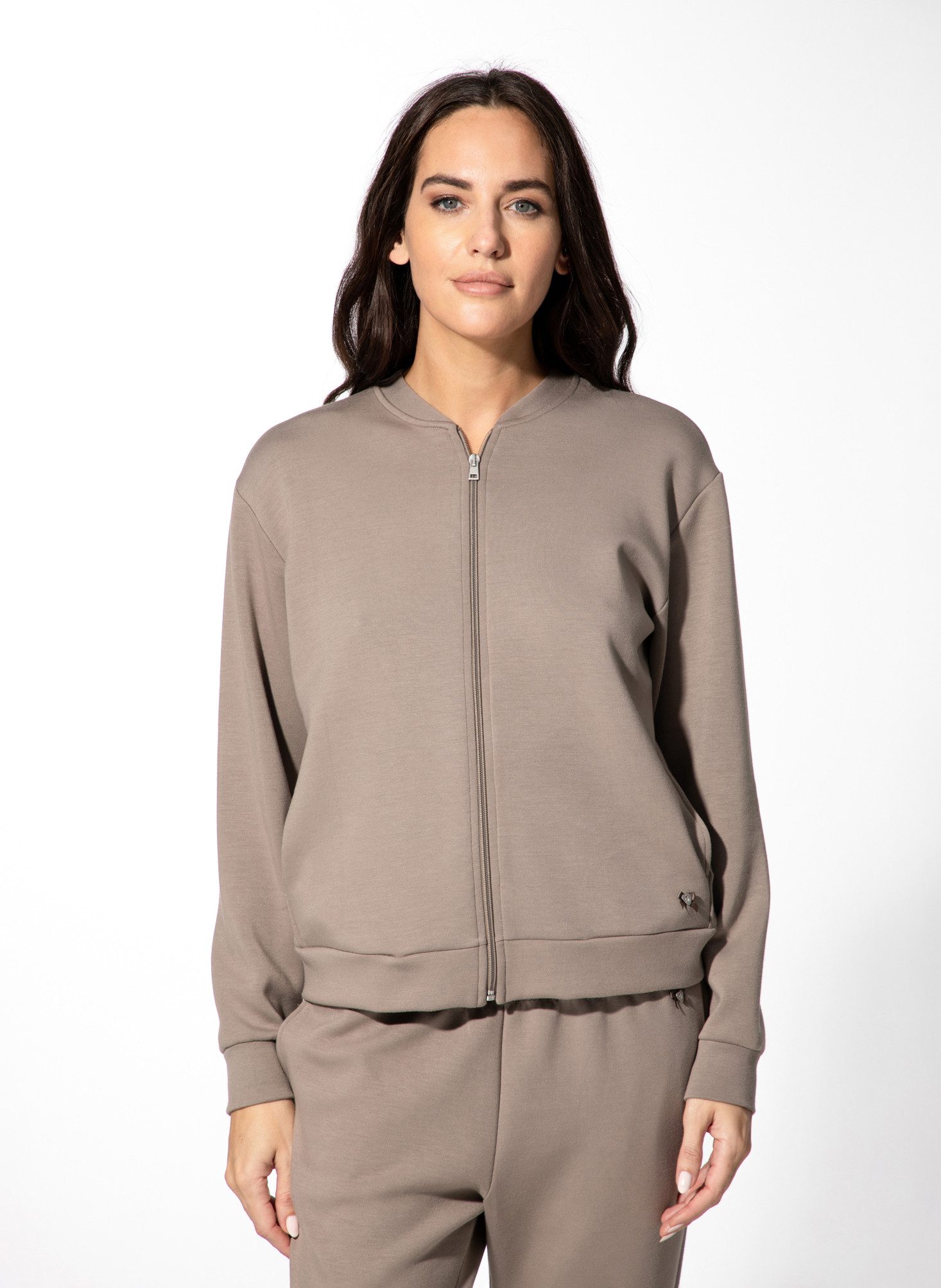 Die Damen-Sweatjacke von SHORT STORIES besteht aus einem hochwertigen Doubleface-Material aus 85 % Viskose, 13 % Polyester und 2 % Elasthan, das sich außergewöhnlich weich, glatt und angenehm elastisch anfühlt. Die Mischung sorgt für ein fließendes Tragegefühl, hohen Komfort und einen besonders edlen Look. Die Sweatjacke verfügt über seitliche Eingrifftaschen, eine praktische Fronttasche, einen durchgehenden Reißverschluss sowie einen sportlich-modernen, leicht gerundeten Kragen, der dem Design eine feminine Note verleiht. Als liebevolles Detail ist links über dem Saum eine kleine Schleife mit Herz-Medaillon angebracht. Der warme, gedeckte Braunton macht die Jacke vielseitig kombinierbar und verleiht ihr eine zeitlose, elegante Ausstrahlung – perfekt für gemütliche Wohlfühlmomente, entspannte Tage zu Hause und stilvolle Casual-Looks. - Damen-Sweatjacke - 85 % Viskose, 13 % Polyester, 2 % Elasthan - Weich und elastisch - Seitliche Eingrifftaschen - Durchgehender Reißverschluss -Sportlich-moderner, leicht gerundeter Kragen -Kleine Schleife mit Herz-Medaillon links über dem Saum -Warmer, gedeckter Braunton