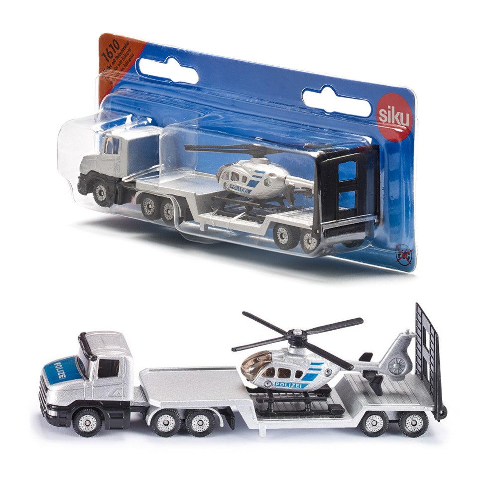 Detailliertes Spielzeugmodell eines Polizei Tiefladers mit Helikopter zum Spielen und Sammeln, Für kleine und große Polizei-Liebhaber Robustes und stabiles Design dank Metallkarosserie, Abkoppelbarer Tieflader, Öffenbare Heckklappe, Drehbare Rotoren, Sehr gute Rolleigenschaften durch Bereifung aus Kunststoff Ideal als Geschenk für Kinder zu bspw. Geburtstagen oder für zwischendurch geeignet, aber auch als Dekoration für Erwachsenen-Geburtstage oder Hochzeitsgeschenke Perfekt zum platzsparenden Mitnehmen, Langanhaltender Spielspaß durch unzählige Kombinationsmöglichkeiten innerhalb der SIKU Spielwelt Lieferumfang: 1x SIKU 1610 Polizei Tieflader mit Helikopter, Material: Metall/Kunststoff, Abmessungen: 15,8 x 4,7 x 4,4 cm, Gewicht: 0,119 kg, Farbe: Silber