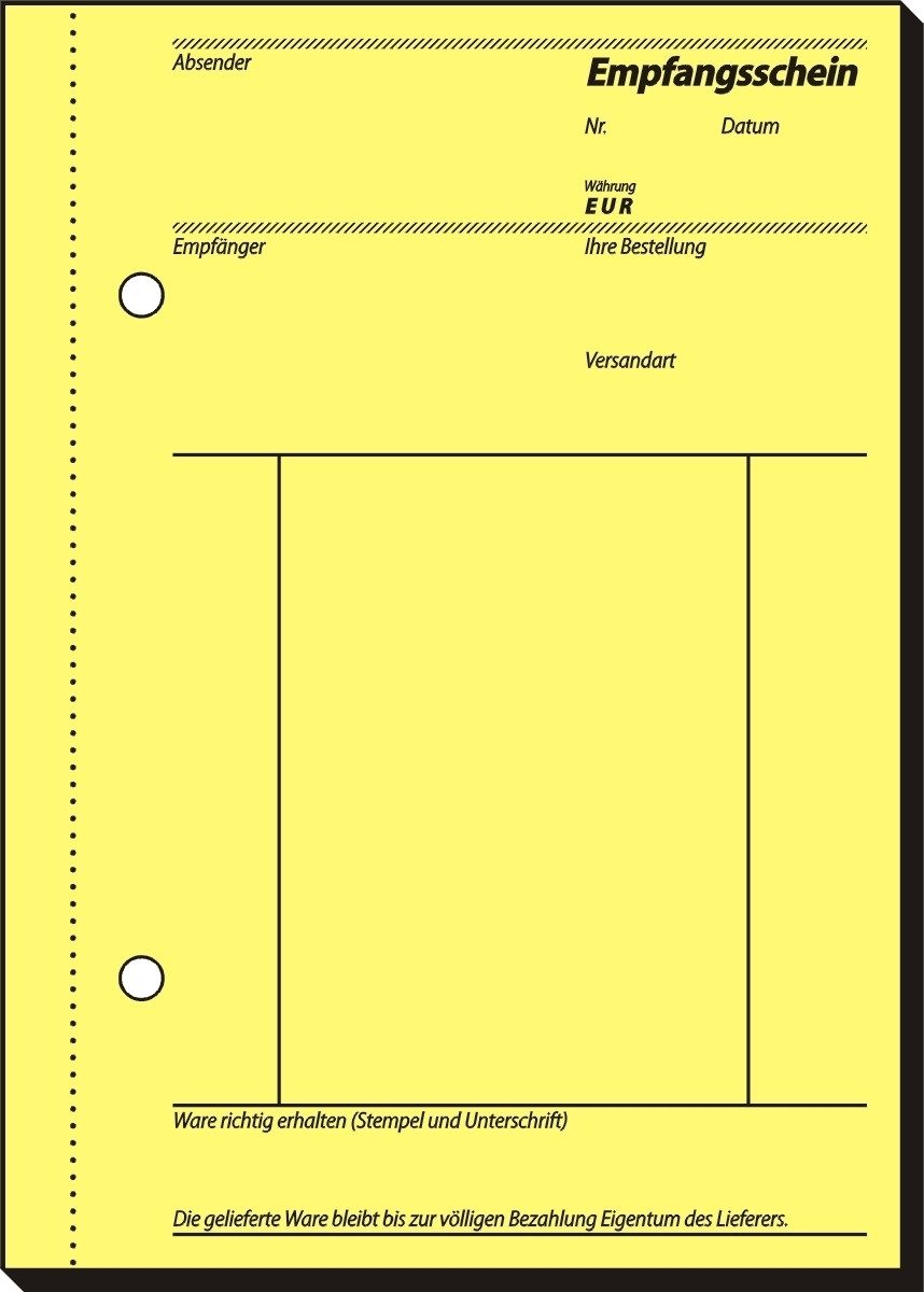 • Ausführung: 1. und 2. Blatt bedruckt, selbstdurchschreibend, Mit Empfangsschein. Farbige Durchschläge