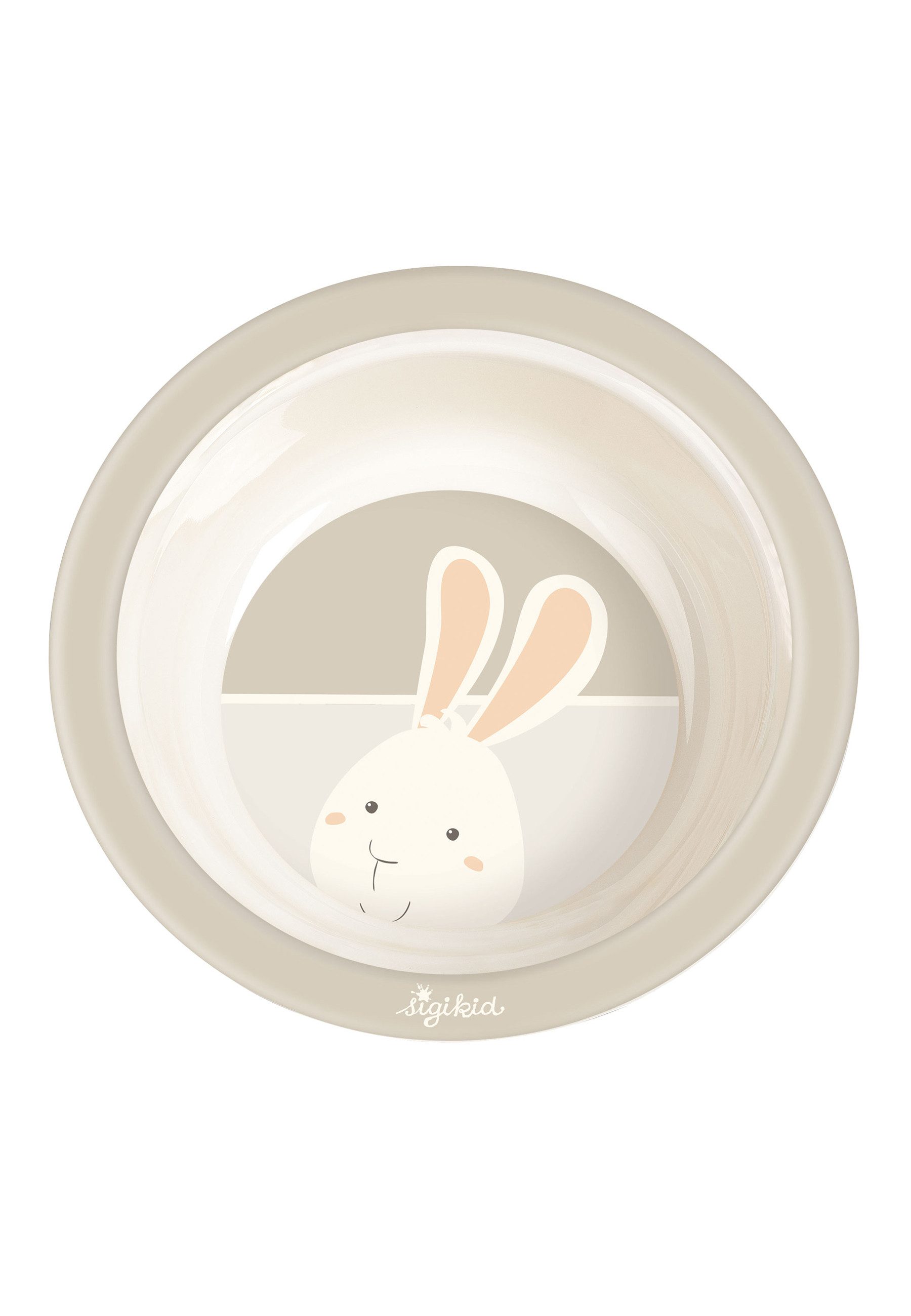Ein Hauch von Zartheit in einem feinen Ecru, kombiniert mit sanften Streifen oder zurückhaltenden Mustern. Die Vanilla-Edition ist für Liebhaber von zarten Pastelltönen, die Design im Minimalismus sehen, aber dennoch für Kinder ausdrucksstarke Artikel suchen. Bezaubernd schön, zeitlos und mit stilvollen Designobjekten fürs Kinderzimmer und den Tisch. Die hübsche Kinderschüssel ist praktisch, sicher und langlebig. Sie bringt Stil auf den Tisch und sorgt für Spaß beim Essen. Mit einem Durchmesser von 15,5 cm ist sie gut geeignet für das Müsli am Morgen, eine Suppe am Mittag, einen Snack am Nachmittag oder den Brei am Abend. Empfohlen wird die Schüssel für Kleinkinder und Kinder von 2 bis 8 Jahren. Der Gummiring am Boden des Schälchens macht das Gefäß rutschfest und sorgt somit für guten Halt auf dem Tisch, der breite Rand lässt sich gut greifen – perfekt für selbständige Mahlzeiten kleiner Kinder. Zu der Geschirr-Serie „Vanilla Hase“ gehören ebenso Teller, Tassen und Besteck im passenden Design. Es besteht zu 100% aus rPET. Dieses Material wird direkt aus Kunststoffen/PET recycelt, welche in der Industrie bei der Produktion anfallen. So möchten wir qualitativ hochwertiges Recycling und Kreislaufwirtschaft fördern. Das Material ist sehr robust, aber nicht komplett unzerbrechlich. Es ist für die Reinigung in der Spülmaschine und für die Verwendung in der Mikrowelle geeignet – bitte hierzu unsere Gebrauchsanleitung beachten. Der Silikonring im Boden kann zur gründlichen Reinigung entnommen werden. sigikid legt besonderen Wert auf ausgesuchte Materialien und durchdachtes Design. Das Geschirr ist selbstverständlich frei von Weichmachern. Um die Sicherheit unserer Produkte zu gewährleisten, werden von akkreditierten Prüfinstituten regelmäßig Prüfungen gemäß dem aktuell geltenden (europäischen) Recht durchgeführt. Die Marke sigikid steht für kindgerechte Produkte. Seit über 55 Jahren folgt sigikid einem klaren Leitsatz: FIRST CLASS FOR KIDS!