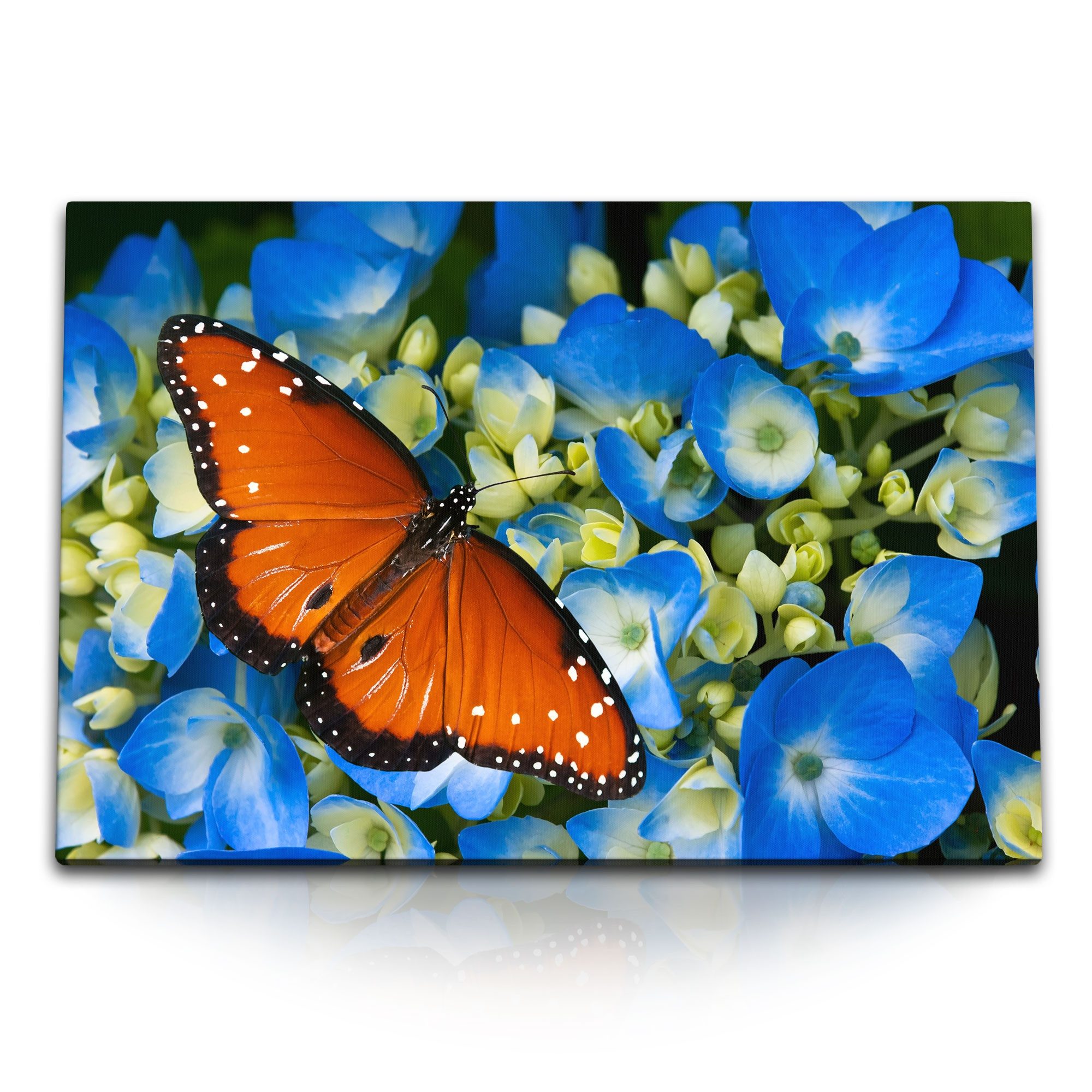 Leinwandbild 120x80cm Schmetterling auf blauen Blumen Blüten Fotokunst - Dieses moderne und exklusive Wandbild ist ein echter Blickfang für Ihr Wohnzimmer, Schlafzimmer, Küche, Büro, Lounge, Garten oder anderen Einrichtungen. Dieser Fine Art Print wird auf hochwertiger Leinwand gedruckt und auf einen 2 cm starken Holzkeilrahmen gespannt. Gedruckt wird mit den besten Techniken auf dem Markt. Die Bilder bestechen durch eine sehr gute Farbqualität und Brillanz. Jedes Leinwandbild wird eigens in unserem Hause und individuell in Handarbeit (Made in Germany) angefertigt, somit ist ein hohes Maß an Qualität gewährleistet. Für deutsche Qualitätsware zum bestmöglichen Preis sind Sie bei uns genau richtig. Unsere Kunstdrucke eignen sich ideal als Geschenk zu Weihnachten, Ostern, Geburtstag, Hochzeit, Muttertag, Vatertag und andere Anlässen, für Freunde und Familie, egal ob alt oder jung. Damit auch Sie schöner Wohnen mit qualitativ hochwertigen Bildern auf echter Leinwand und Keilrahmen. Einfach auspacken, aufhängen und sich daran erfreuen. TIPP: Diese Dekoration ergänzt wunderbar Möbel wie z.B. Betten, Couch, Sofa, Tisch, Schrank, Küchen usw. gespannt. Traumhafte Accessoires für Ihr Zuhause.