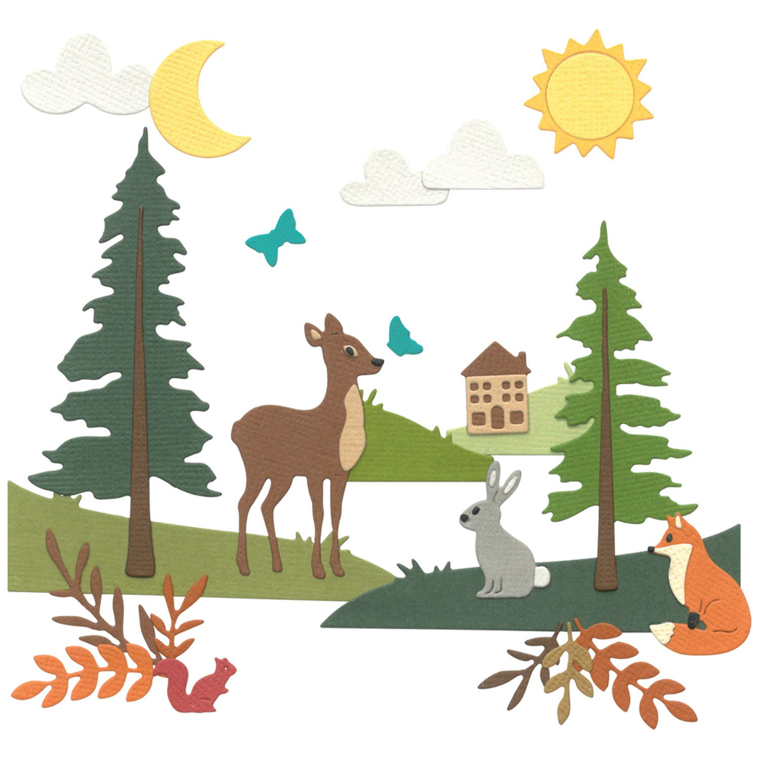 Mit der Sizzix Thinlits Stanzschablone 'Home Sweet Home by Eileen Hull' bringst du zauberhafte Waldmotive in deine Kreativprojekte. Die Stanzschablone aus Metall besteht aus 24 Teilen und ermöglicht dir, Tannen, Reh, Hase und Fuchs aus verschiedenen Kreativpapieren zu gestalten. Die Motivgröße variiert von 1,59 cm x 0,95 cm - 3,81 cm x 8,57 cm. Ideal für Scrapbookarbeiten, Grußkarten, Geschenkverpackungen und mehr. Kombiniere sie einfach mit anderen Stanz- oder Prägeschablonen, um einzigartige Designs zu kreieren. Verleihe deinen Projekten einen Hauch von Natur.