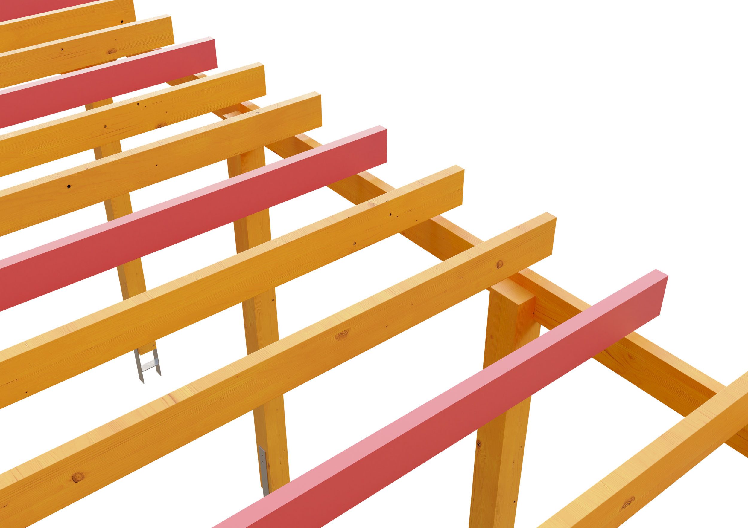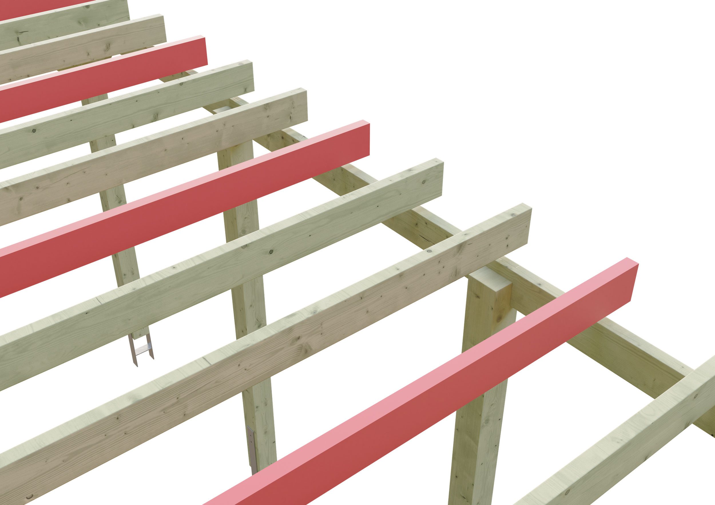 Die SKAN HOLZ Schneelasterhöhung besteht aus zusätzlichen Sparren, die Sie zwischen die bestehenden Dachsparren montieren. So verringern Sie den Sparrenabstand des Carports und erhöhen dadurch die Tragkraft insgesamt. Die Anzahl und Größe der Sparren variiert je nach Carport.