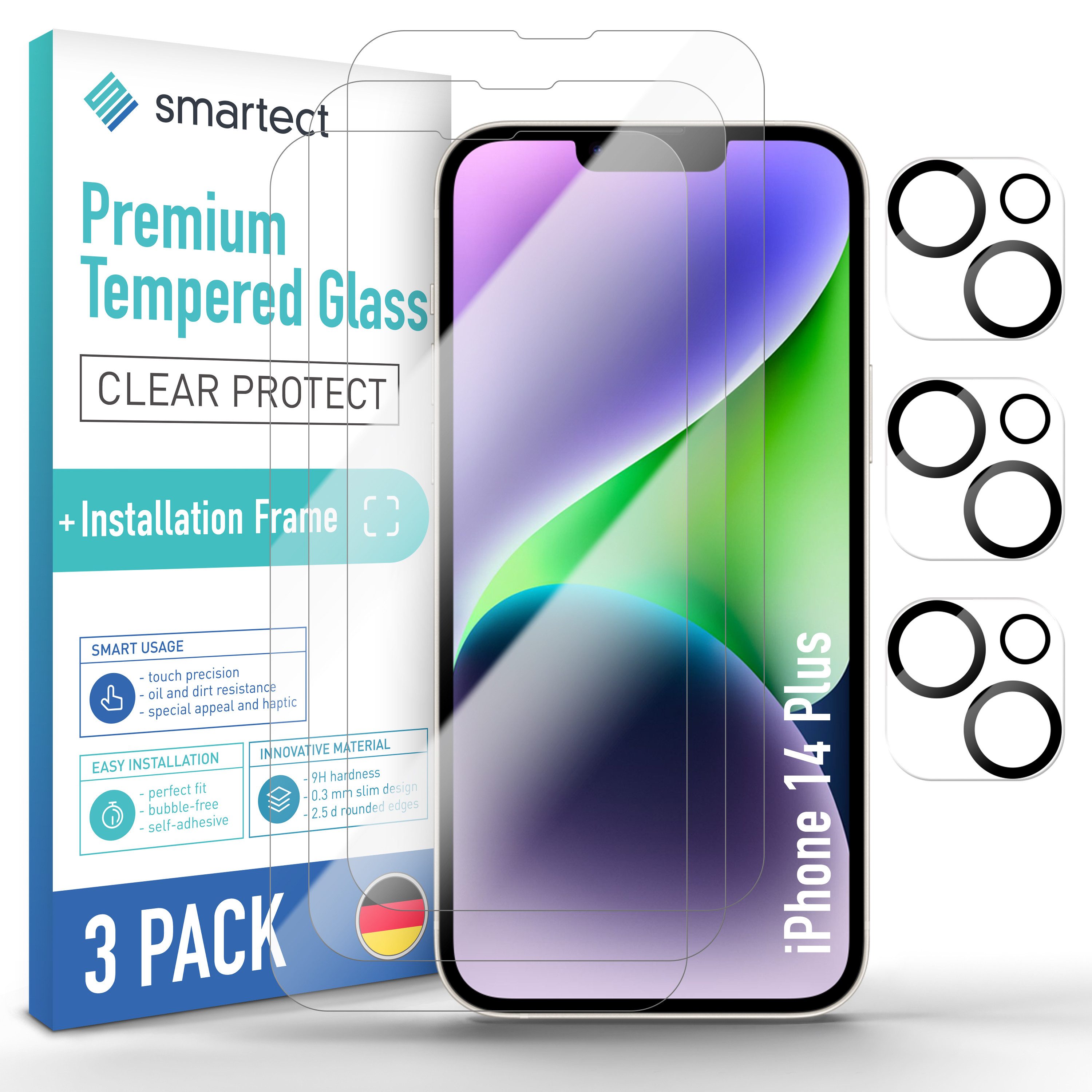 | Lieferumfang | 3 Schutzgläser, 3 Kameraschutzgläser, 1 Positionierhilfe, 3 Feuchttücher, 1 Mikrofasertuch, 2 Antistaub-Sticker, mehrsprachige Bedienungsanleitung |