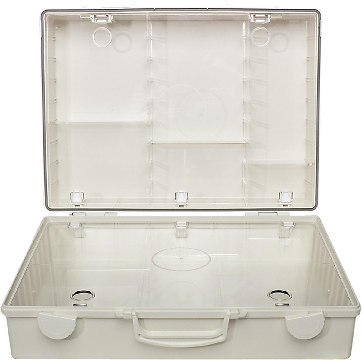 • Zwei gleich große Kofferschalen, transparente Abdeckplatten, umlaufende Gummidichtung, Inneneinteilung verstellbar, leichtgängige Drehverschlüsse, verstärkter Tragegriff,