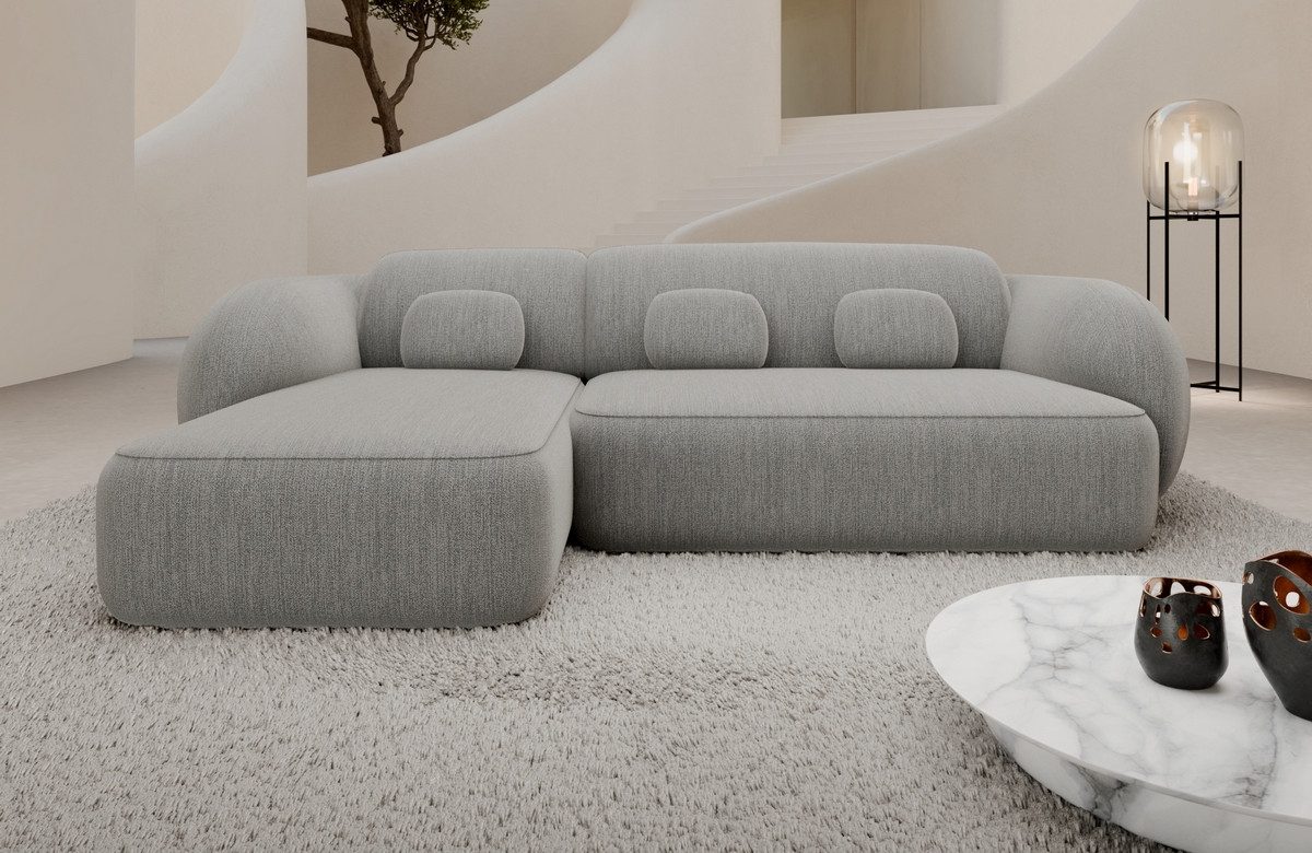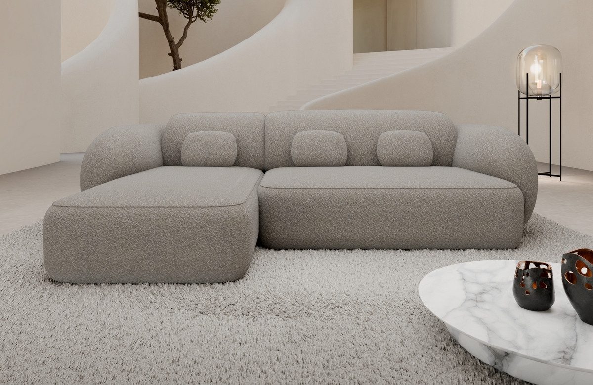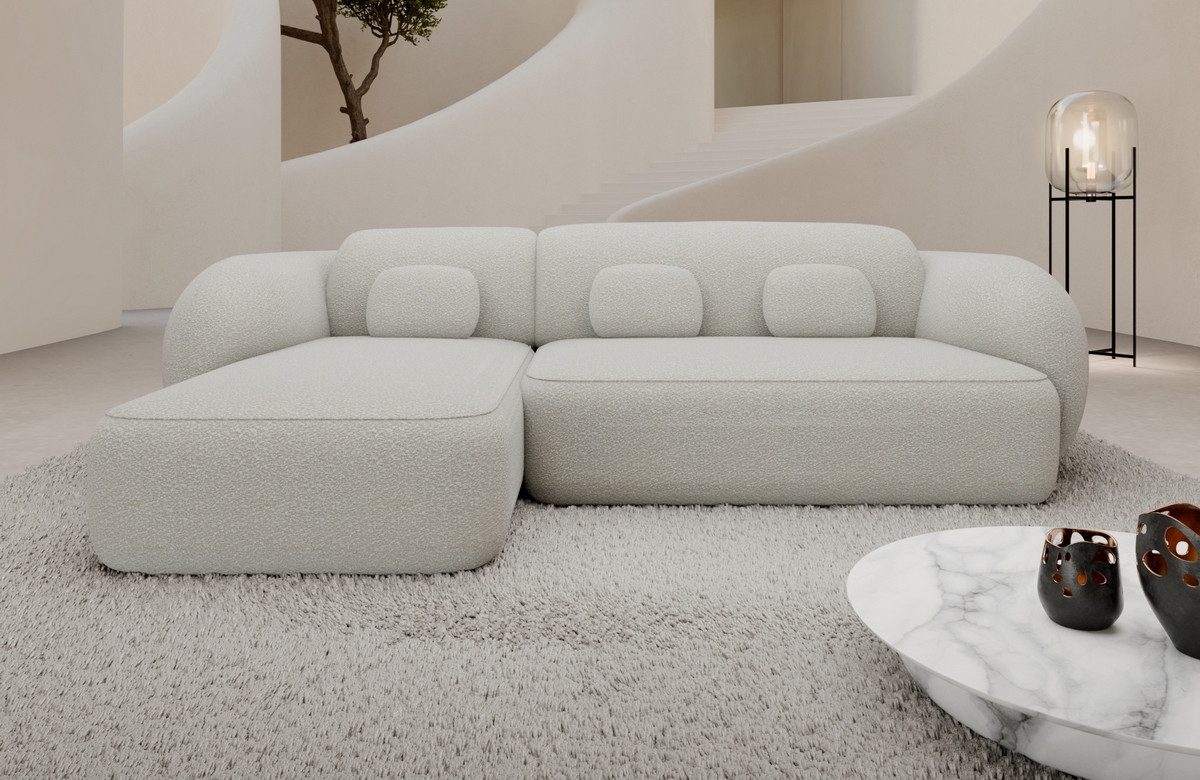 Der Boucléstoff liegt voll im Trend und begeistert durch seine unverwechselbare, unregelmäßige Oberflächenstruktur. Seine weich gewobenen Schlingen sorgen für eine kuschelige, gemütliche Haptik und ein besonderes visuelles Highlight. Bouclé wirkt einladend und verleiht dem Sofa ein modernes, skandinavisch inspiriertes Flair. Trotz seiner weichen Struktur ist der Stoff langlebig und robust, sodass er sich auch für Familien und Vielnutzer bestens eignet.