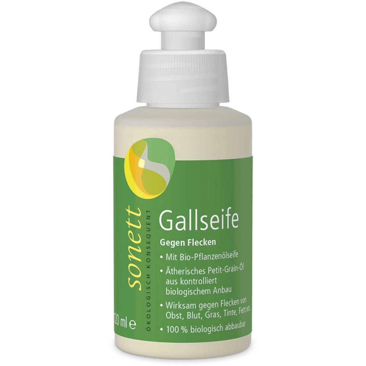 Rindergalle gehört zu den traditionellen Fleckenmitteln, deren Hauptwirkstoffe, die Gallensäuren Chol- und Taurocholsäure, Fette und fettähnliche Stoffe fein dispergieren, sowie Farbstoffe lösen und an sich binden können. Seife, hergestellt aus Rapsöl / Sonnenblumenöl und Olivenöl mit Lauge quillt und löst den Schmutz und unterstützt die Fleckenlösekraft der Rindergalle. Zuckertensid wird aus den rein pflanzlichen Rohstoffen Zucker, Stärke und Kokosfett durch chemische Umsetzungen mit Hilfe von Säuren gewonnen. Orangenterpene aus Orangenschalen verstärken zusätzlich die Fettlösekraft der Sonett Gallseife.