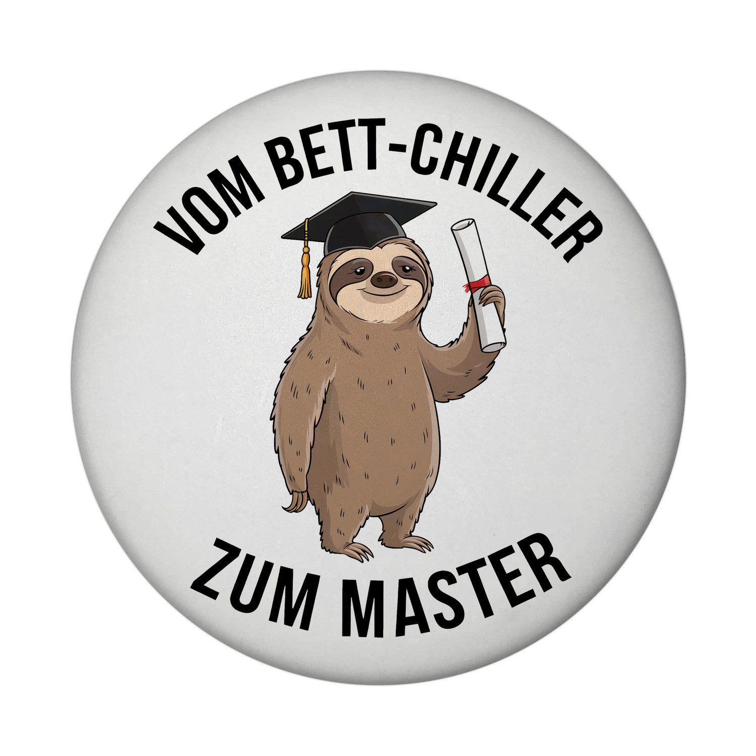 Der runde Magnet zeigt ein Faultier mit Diplom. Ideal als Geschenk zum Masterabschluss oder Motivation am Kühlschrank – humorvoller Lebensstil trifft akademischen Erfolg!