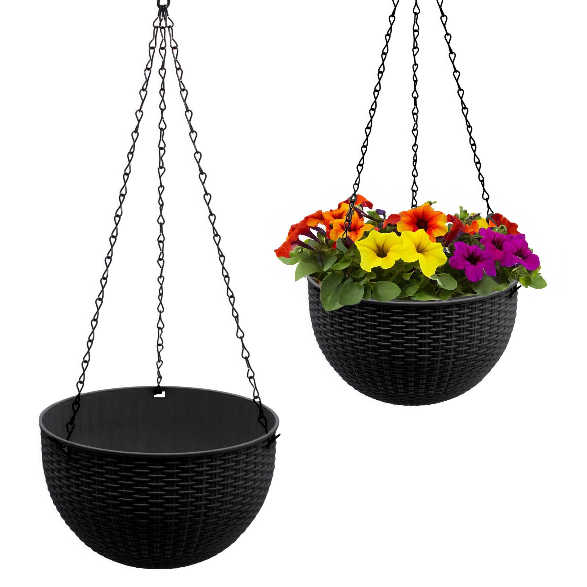 Blumenampel weiß in Rattan Optik 23 cm - 2er Set - Kunststoff Hängeampel mit Ablauf und Metallkette