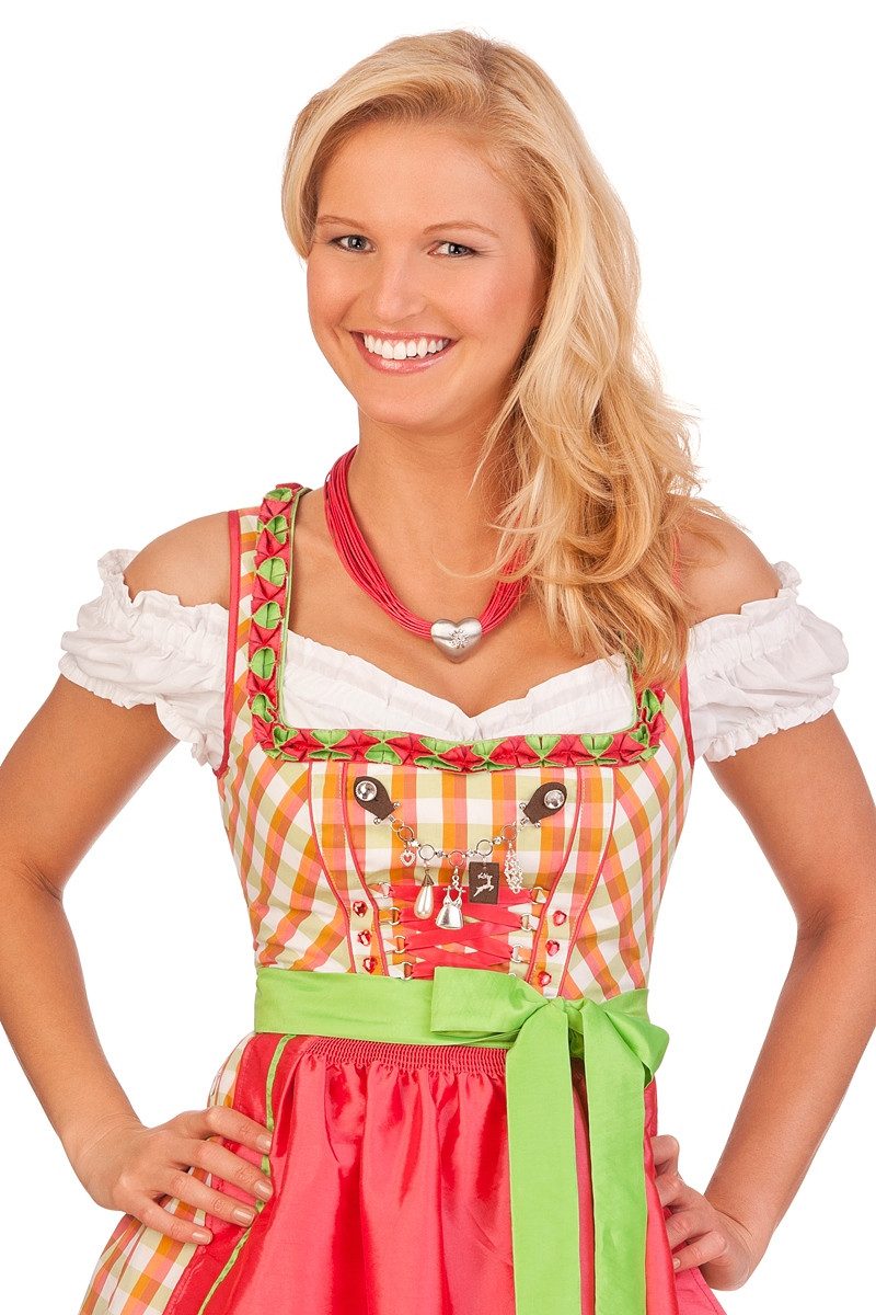 Ein Sommerdirndl - wie es leuchtender nicht sein kann! Noch besser kann man Frische und Lebenslust nicht präsentieren. Wunderschönes, trendiges Minidirndl in strahlendem Design! Der herzförmige Ausschnitt des farbenfrohen Karokleides ist mit einer Froschmaulborde verziert. Edel wirkt der kleine Charivari am Ausschnitt. Trennungsnähte und Paspeln sind farblich auf das Dirndel abgestimmt und spiegeln die sehr gute Verarbeitung wieder. Aufwendige Miederschnürung. Mieder abgefüttert. Reißverschluß hinten. Verschließbare Eingrifftaschen links und rechts. Die Schürze ist traditionell am Bund gehanselt, mit Stickereien und Herz-Applikationen veredelt. Der Lieferumfang beinhaltet das Minidirndl und die Dirndlschürze, aber nicht die Bluse!